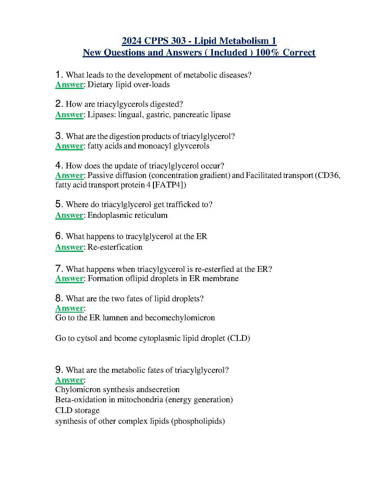 2024 CPPS 303 - Lipid Metabolism 1: New Questions and Answers (Included) 100% Correct by Author Name