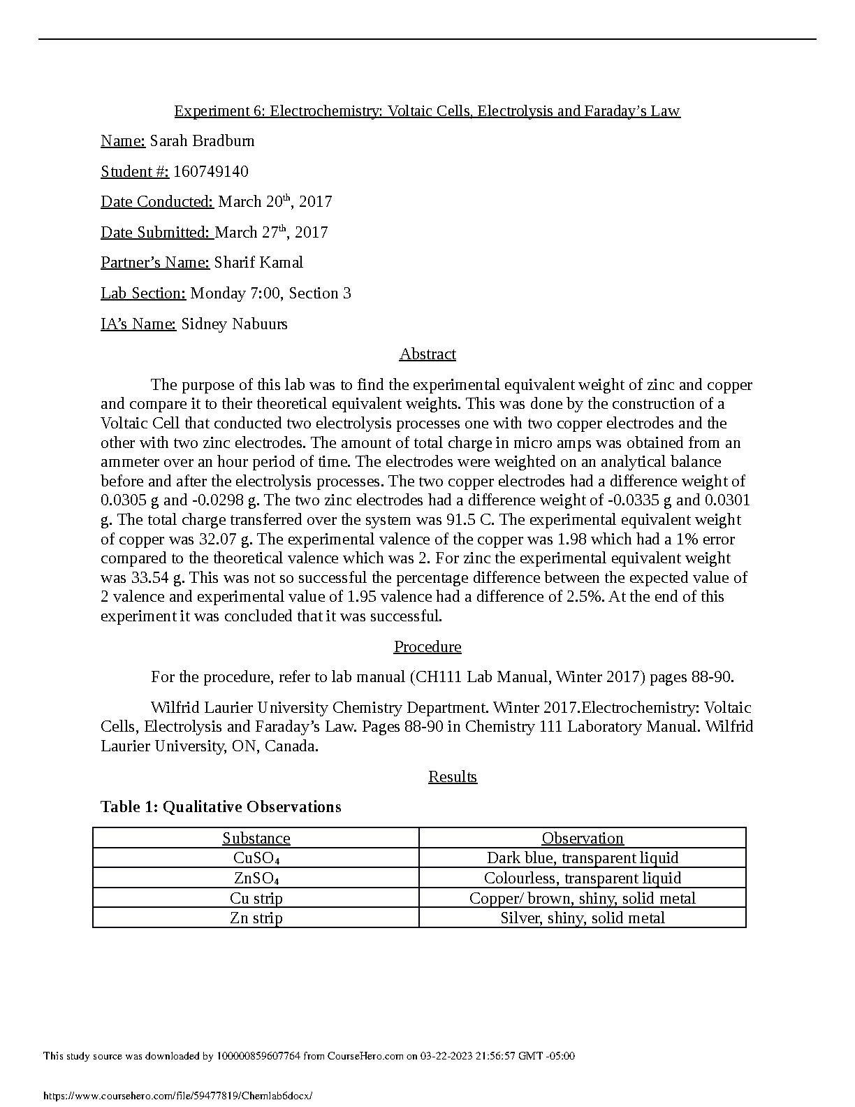 Electrochemistry: Voltaic Cells, Electrolysis and Faraday's Law, 111 Edition by Wilfrid Laurier University Chemistry Department