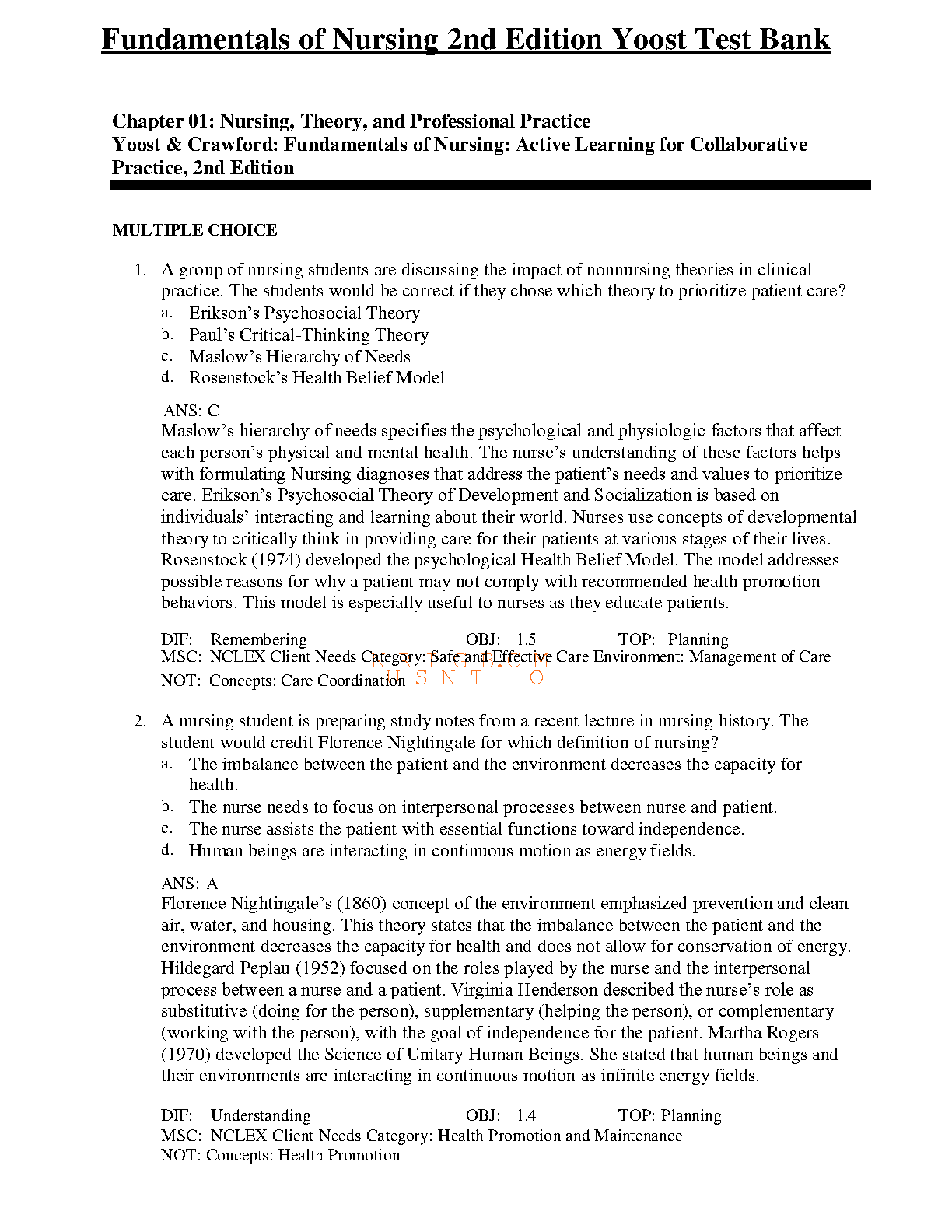 This comprehensive test bank covers all chapters of the 2nd edition of Fundamentals of Nursing by Barbara L. Yoost & Lynne R. Crawford. It's an invaluable resource for nursing students aiming to excel in their exams and avoid resits.