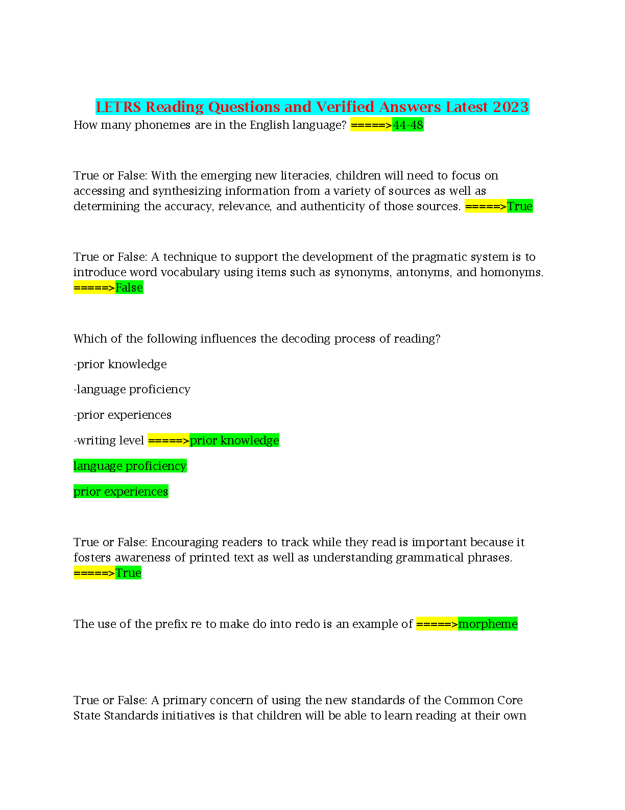 LETRS Reading Questions and Verified Answers Latest 2024 - 2025 Edition by Louisa Moats, S.T. L. Moats