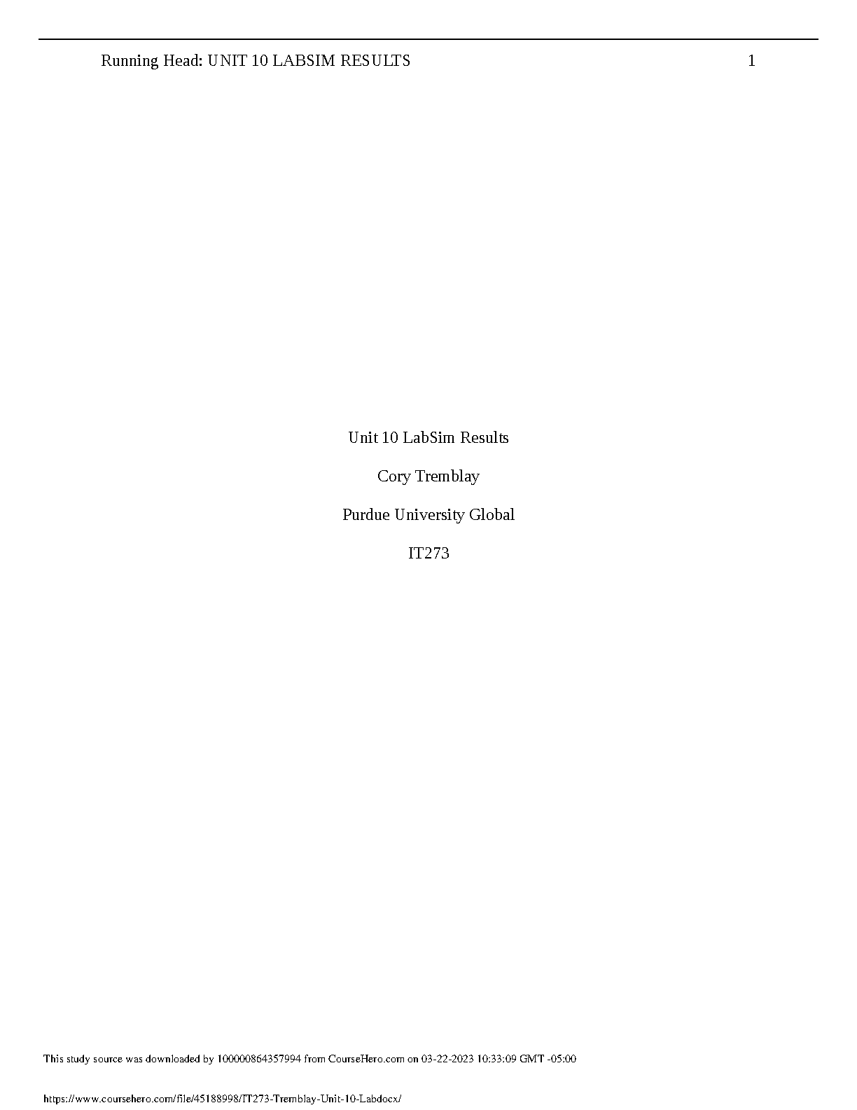 IT273 Unit 10 LabSim Results by Cory Tremblay - Purdue University Global Get access to the Unit 10 LabSim Results for IT273 course at Purdue University Global, authored by Cory Tremblay. This resource will help you understand the key concepts and practice