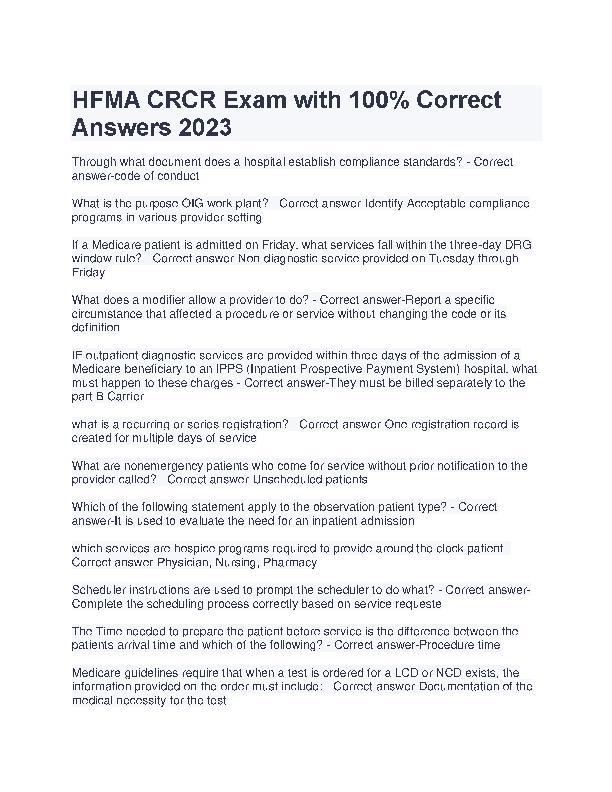 HFMA CRCR Exam with 100% Correct Answers 2023 Edition by HFMA