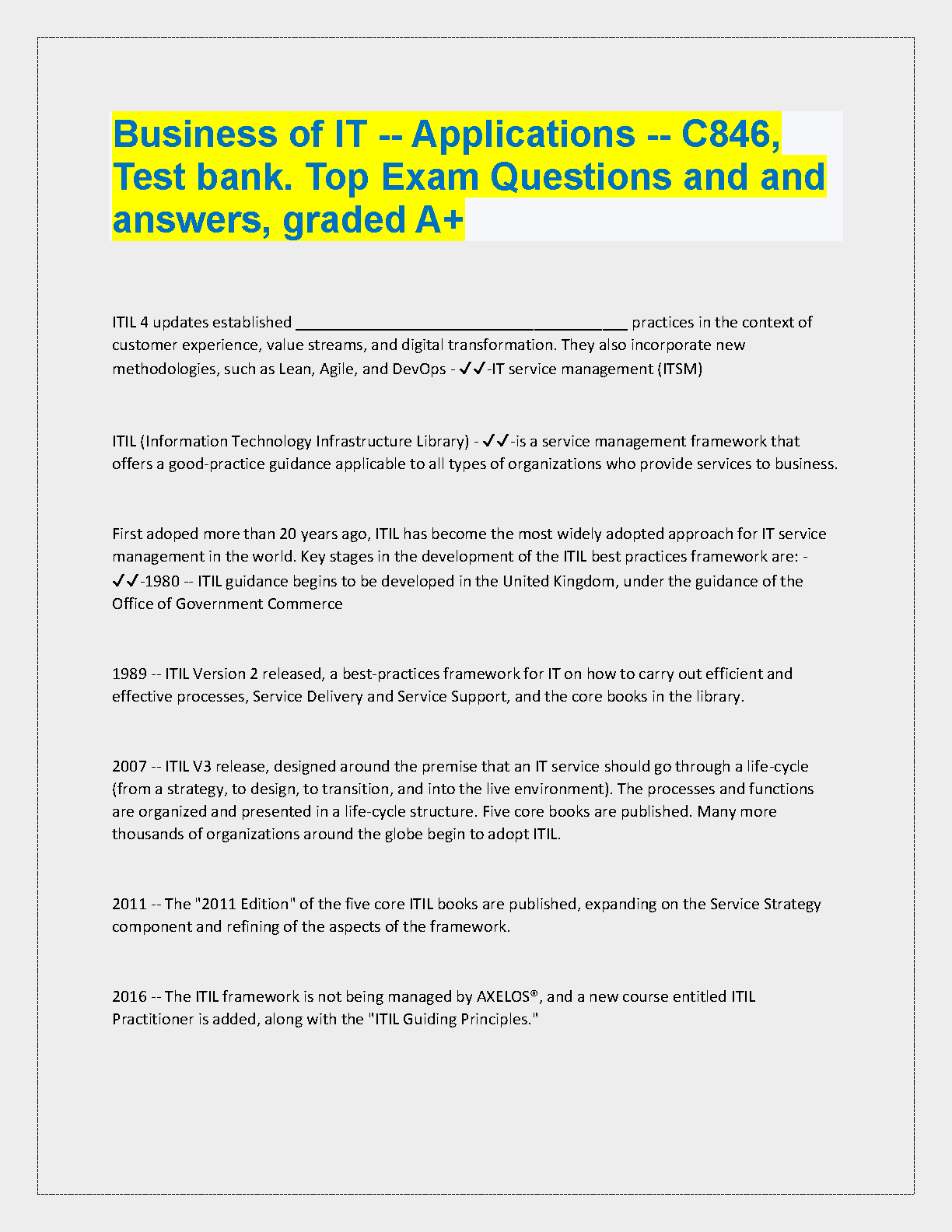This study guide is designed to help you prepare for the ITIL 4 exam and pass on your first attempt. The book covers all of the ITIL 4 material, including updates, value streams, and digital transformation. It provides a comprehensive overview of the ITIL framework, covering essential concepts such as service management practices, and IT service management (ITSM). It's a complete guide for ITIL 4 practitioners with test bank questions and answers.