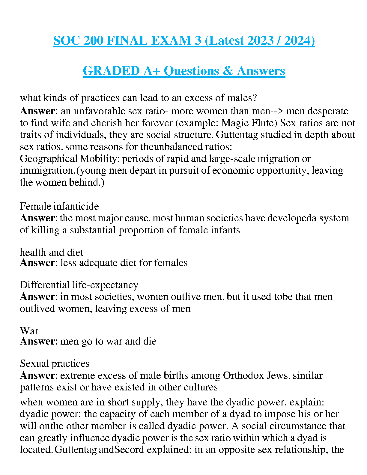 This study guide contains all the questions and answers for SOC 200 Final Exam 3 (Latest 2023/2024). The questions are graded A+ by the instructor and cover topics like sex ratios, female infanticide, health and diet, differential life expectancy, war, and sexual practices. Use this guide to prepare for your exam and ace it on your first attempt.