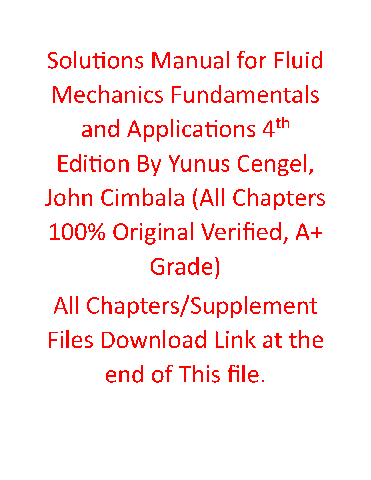 This solutions manual for the 4th Edition of Fluid Mechanics Fundamentals and Applications by Yunus Cengel and John Cimbala will help students achieve top grades. With detailed step-by-step solutions to all the exercises in the textbook, students will gain a comprehensive understanding of fluid mechanics concepts and learn how to apply them in practice.