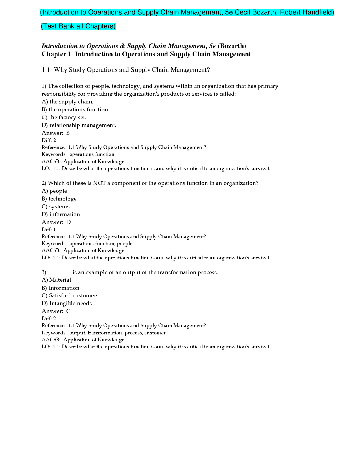 Conquer your operations and supply chain management exams with this comprehensive test bank for the 5th edition of Introduction to Operations & Supply Chain Management by Bozarth and Handfield. This invaluable resource includes a wealth of practice questions covering all key concepts, ensuring you're fully prepared to succeed on your first attempt.