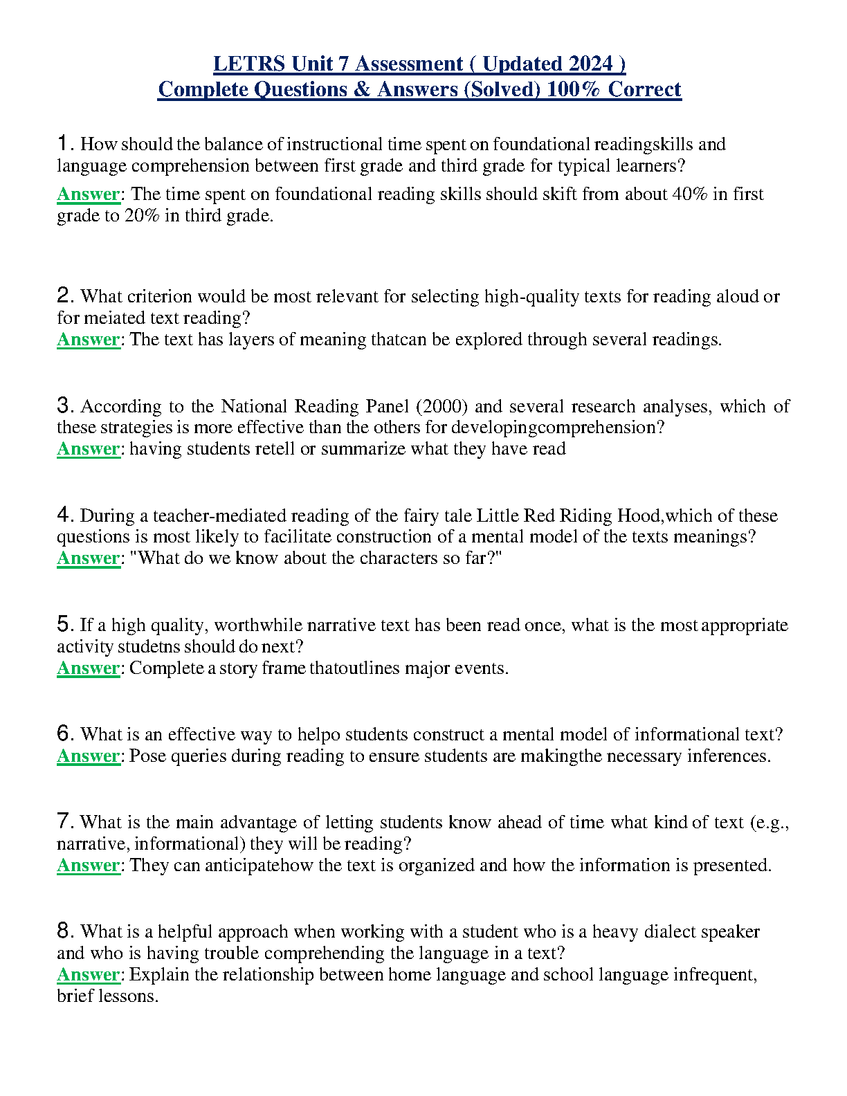 This resource provides complete solutions to all the questions and answers for LETRS Unit 7 Assessment (Updated 2024). All solutions are carefully crafted for a 100% correct score, making it an excellent tool for studying and preparing for exams.