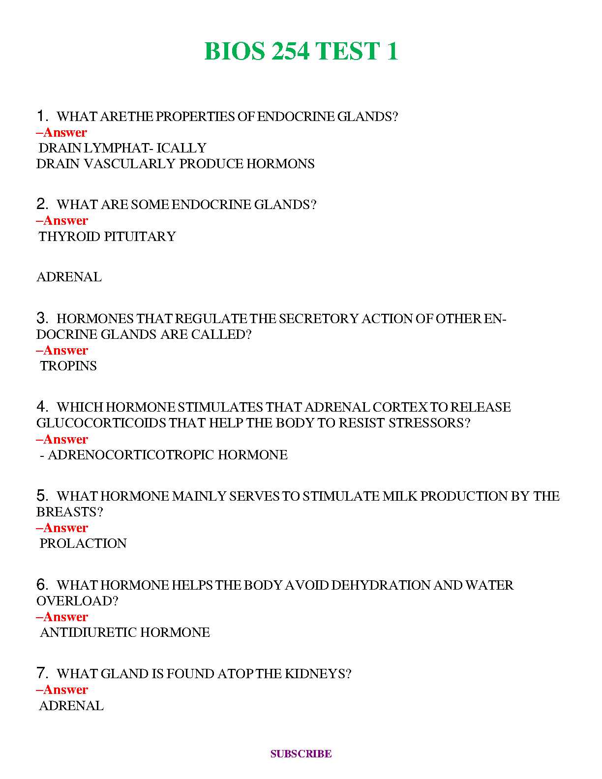 BIOS 254 Test 1: Endocrine System Quiz for Biology Students