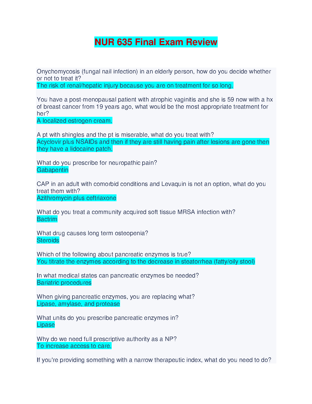 This comprehensive NUR 635 Final Exam Review guide, meticulously crafted for the 2024/2025 academic year, equips nursing students with the knowledge and skills they need to ace their final exams. It covers essential concepts and clinical scenarios, providing a targeted approach to maximizing exam performance and avoiding resits.