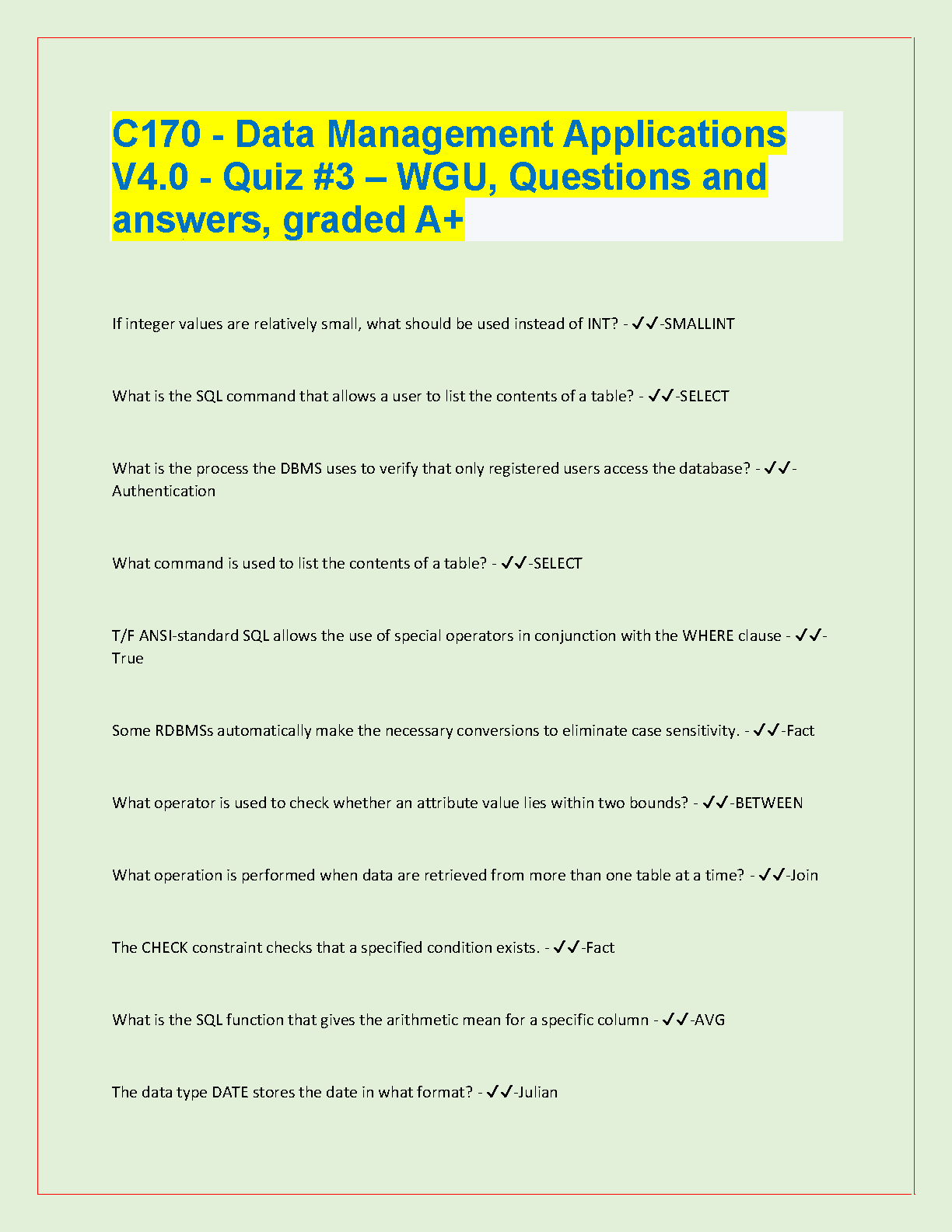 Data Management Applications V4.0 - Quiz #3 - WGU, Questions and answers, graded A+ by [Author Name]