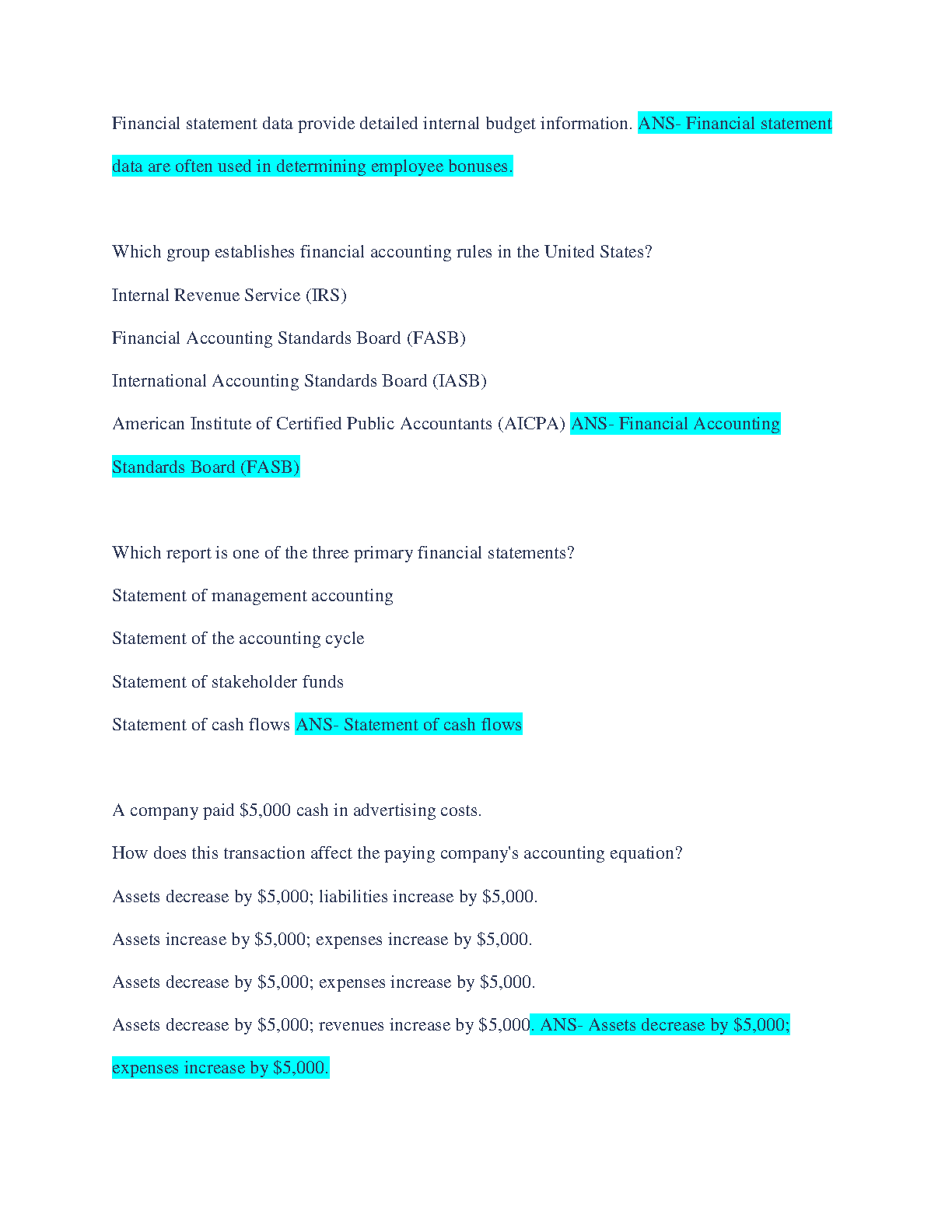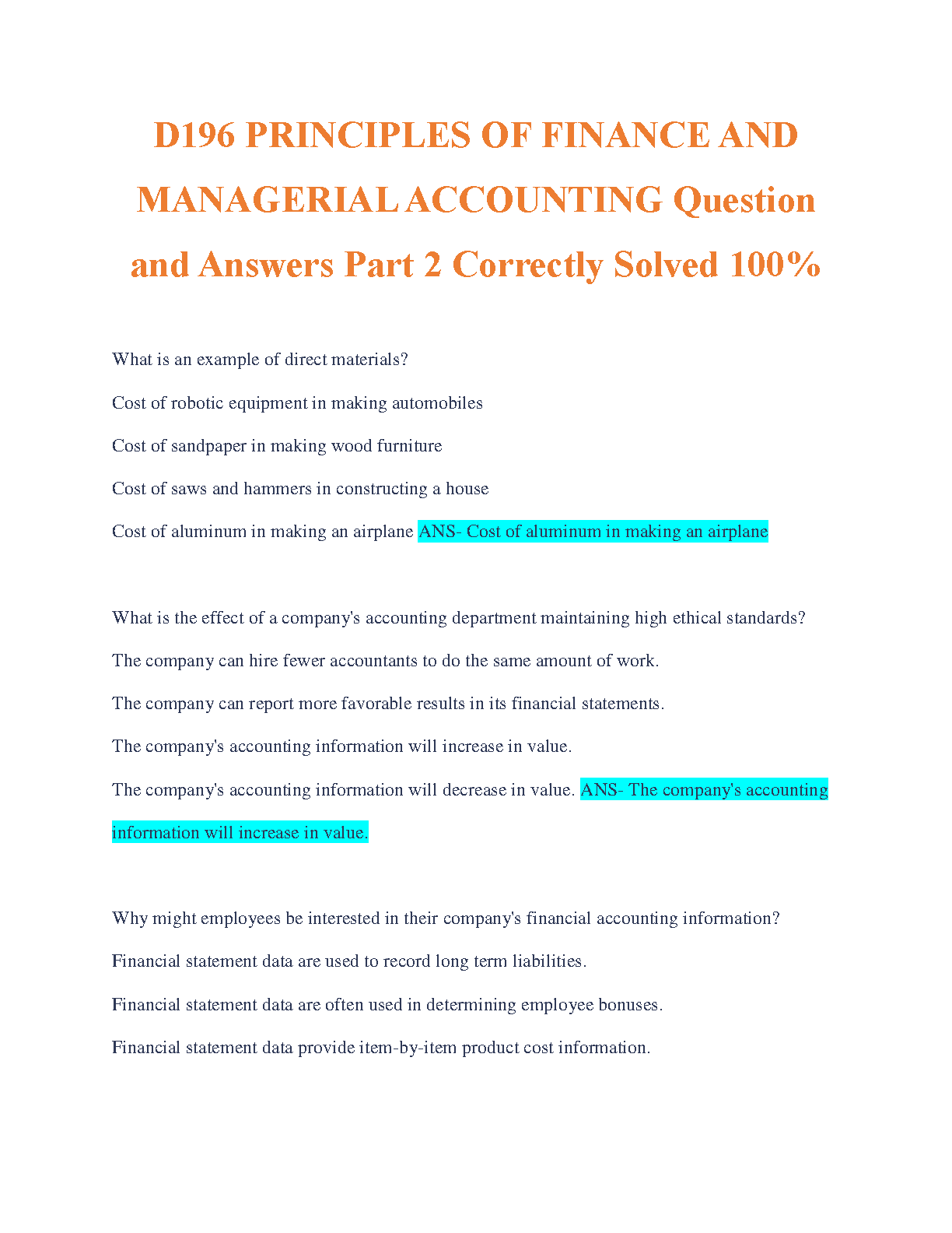 D196 Principles of Finance and Managerial Accounting Question and Answers Part 2 - Correctly Solved 100% - 2024/2025 Edition