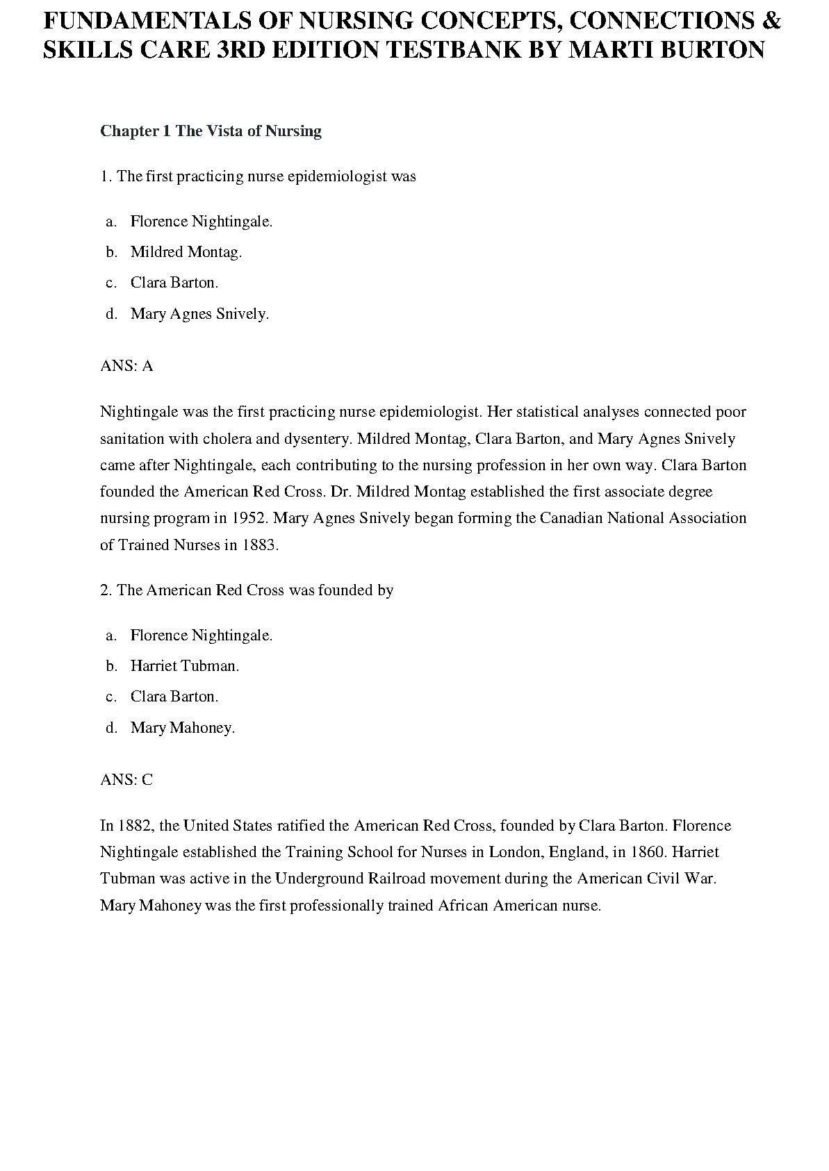 Fundamentals of Nursing Concepts, Connections & Skills Care 3rd Edition Testbank by Marti Burton, Mildred Montag, Clara Barton, Mary Agnes Snively
