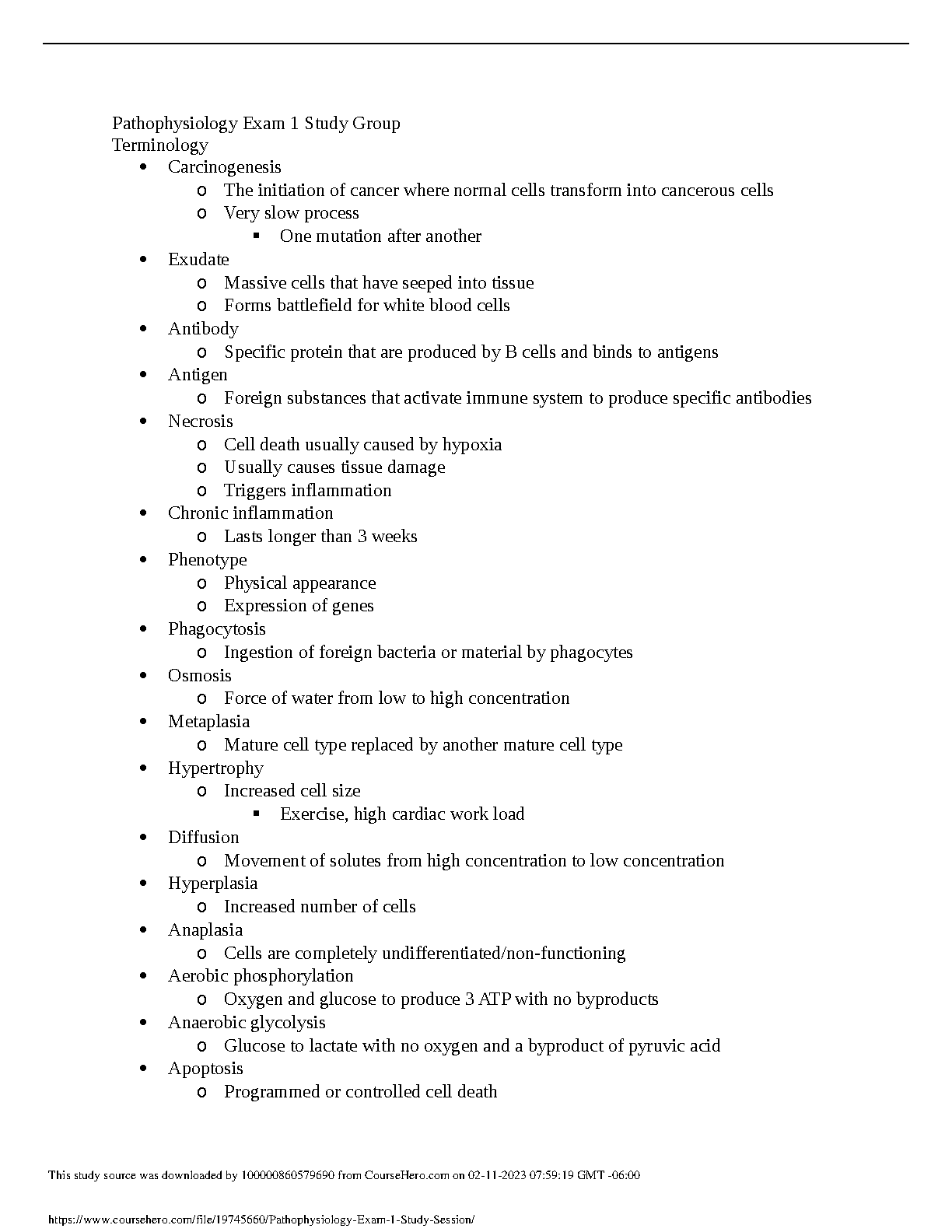 This comprehensive study guide covers essential pathophysiology concepts, including terminology, cellular processes, and more, designed to help students excel in their exams and achieve mastery in the subject. It includes detailed explanations, examples, and practice questions for a thorough understanding of pathophysiological principles.