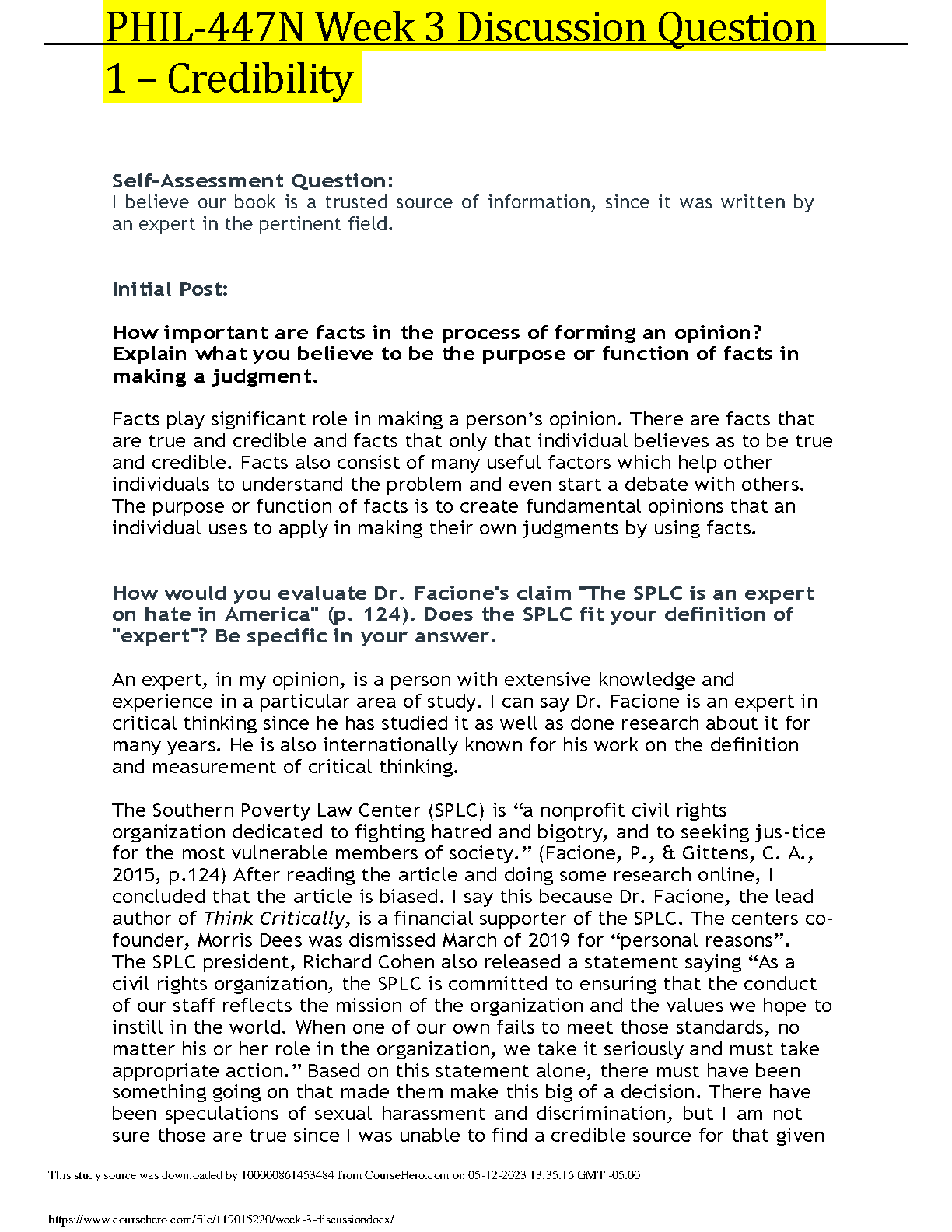PHIL 447N Week 3 Discussion Question: Credibility - Richard Cohen, Peter Facione, and C.A. Gittens Edition