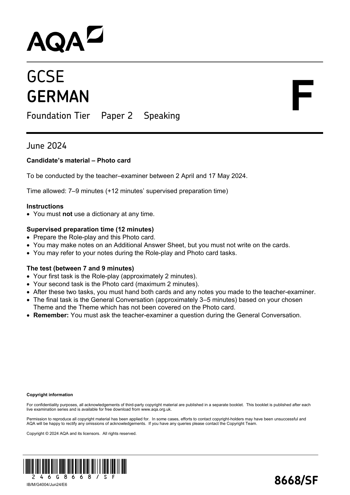 AQA GCSE GERMAN FOUNDATION TIER PAPER 2 2024 (8668/2: SPEAKING).