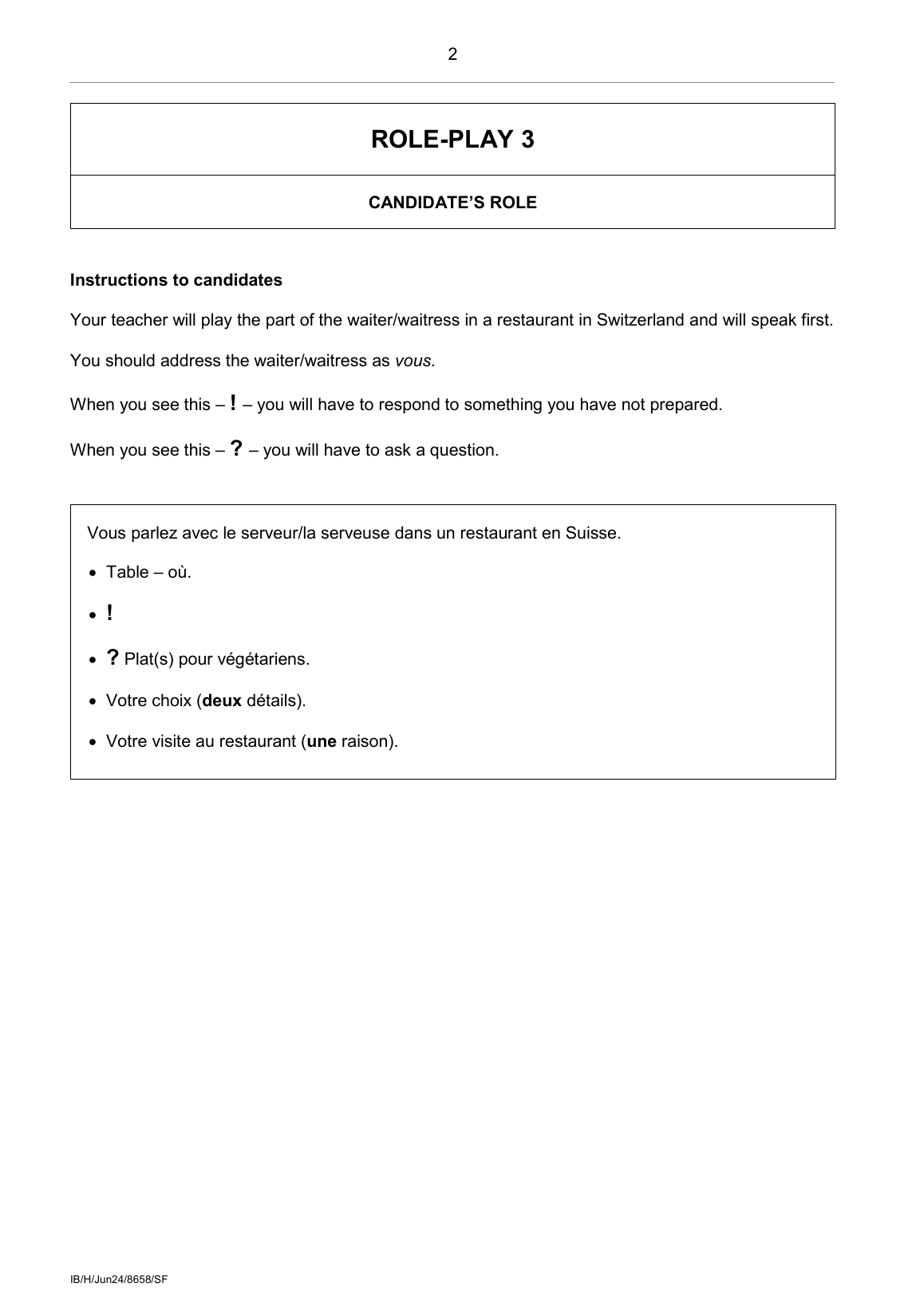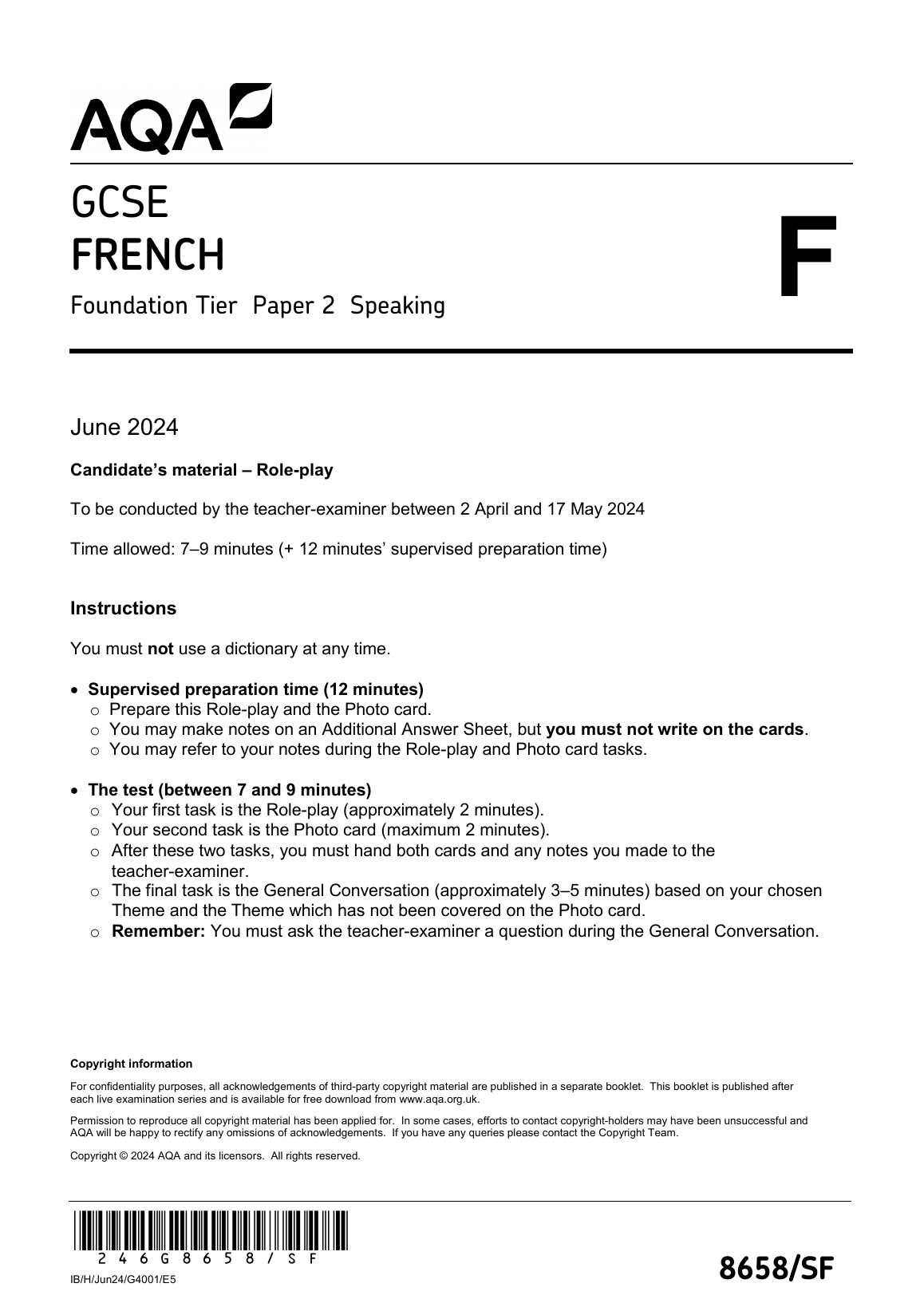AQA GCSE FRENCH QUESTIONS PAPER 2 2024 (8658/SF: Foundation Tier Speaking)
