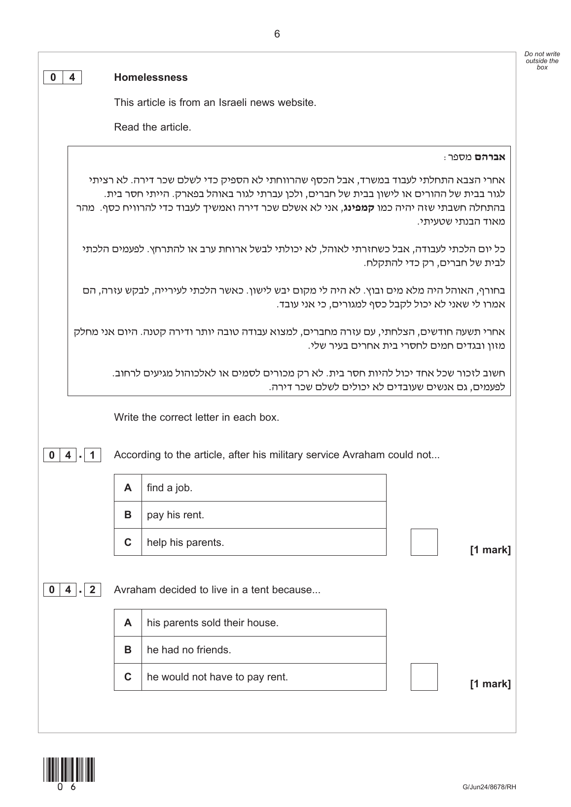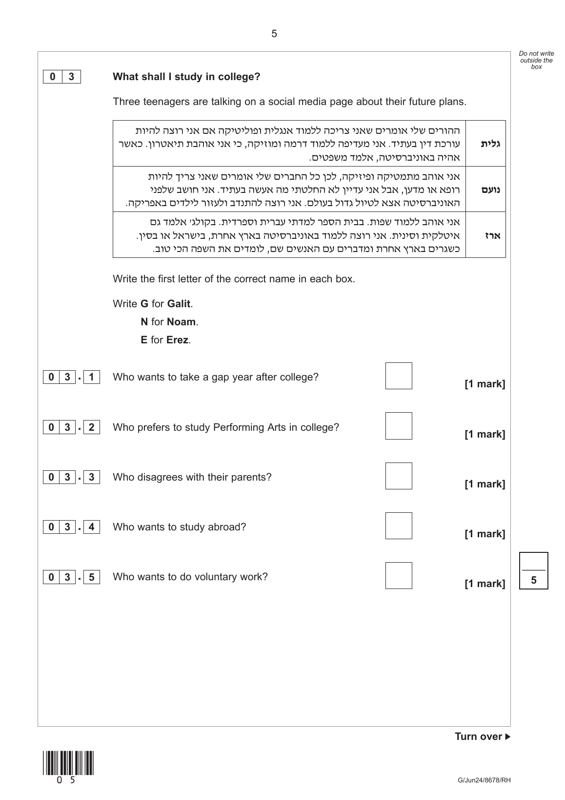 AQA GCSE MODERN HEBREW HIGHER TIER PAPER 3 2024 (8678/3: READING).