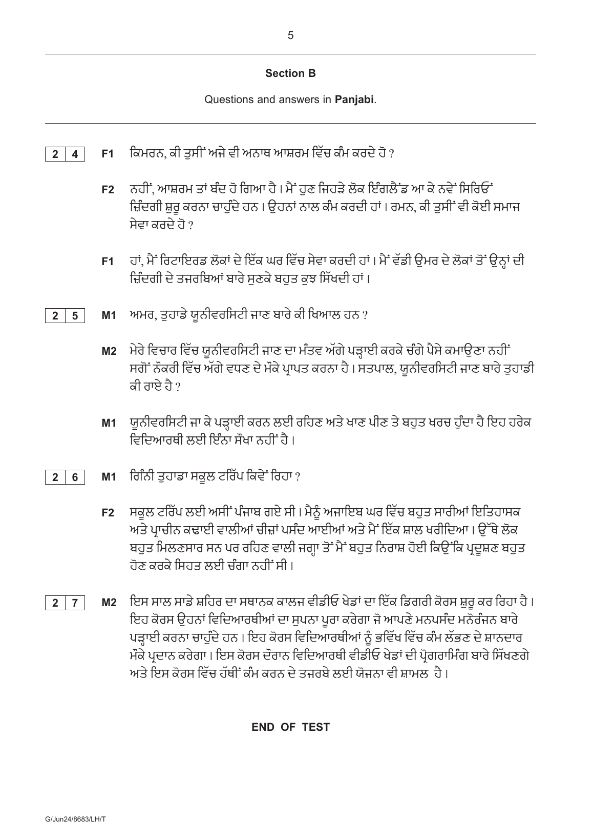 AQA GCSE PANJABI QUESTIONS PAPER 1 2024 (8683/LH/T: Higher Tier Listening Test Transcript).