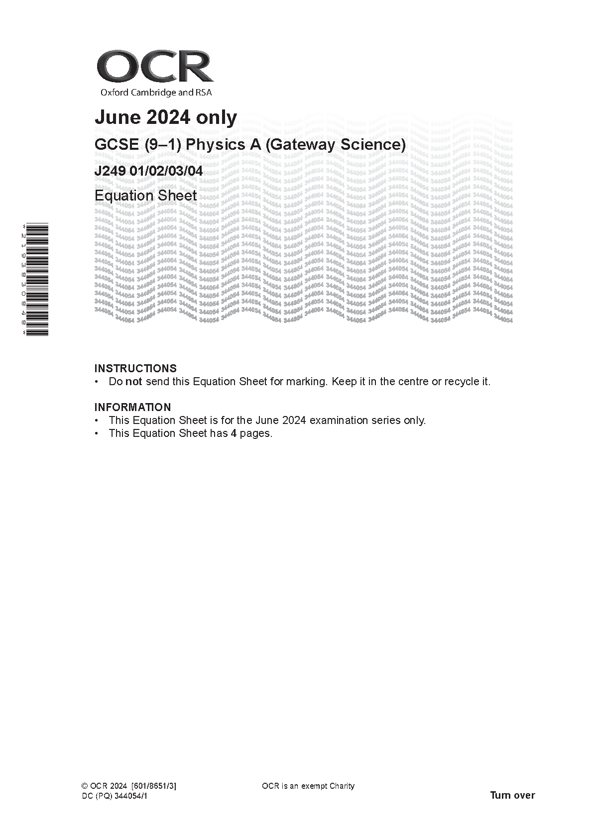 OCR GCSE Physics A 2024 Equation Sheet (J249 01/02/03/04).