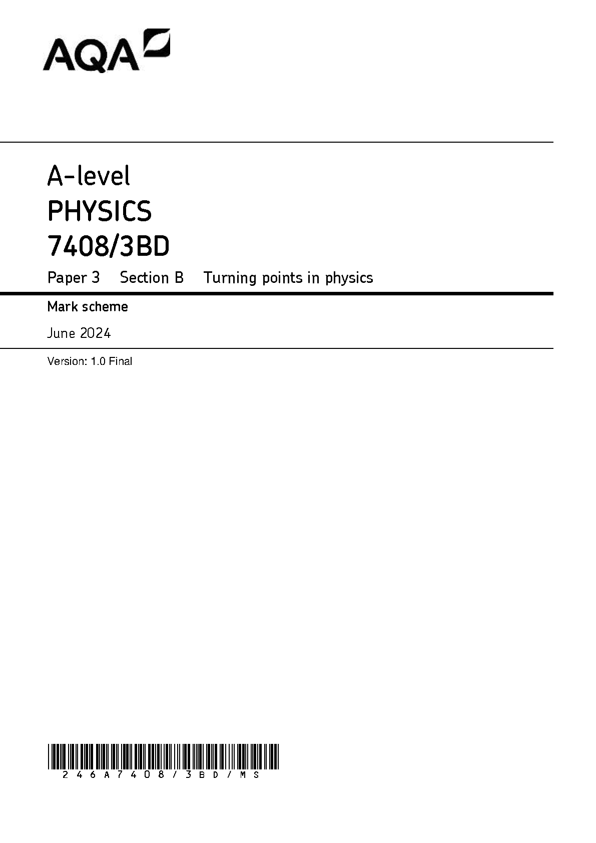 AQA A LEVEL PHYSICS MARK SCHEME PAPER 3 2024 (7408/3BD: Turning points in physics).