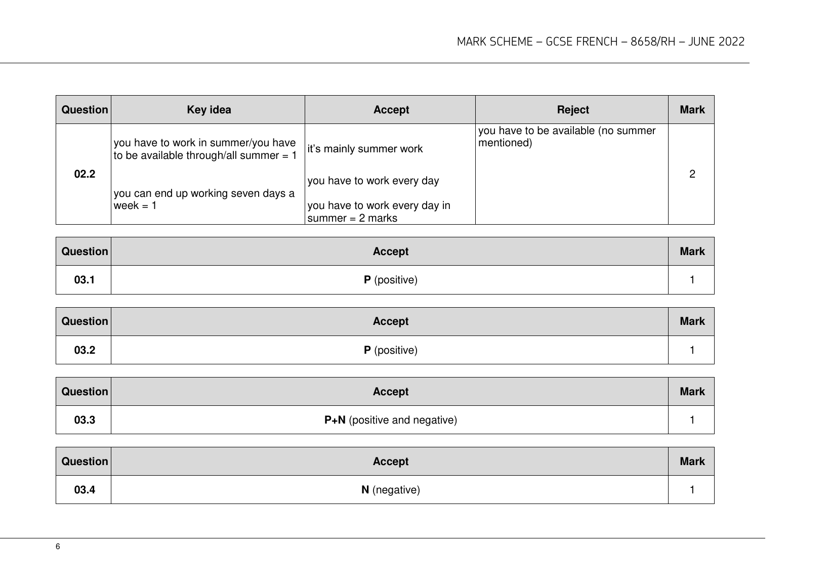 AQA GCSE FRENCH PAPER 3 JUNE 2022 MARK SCHEME (8658/RH: Higher Tier - Reading)