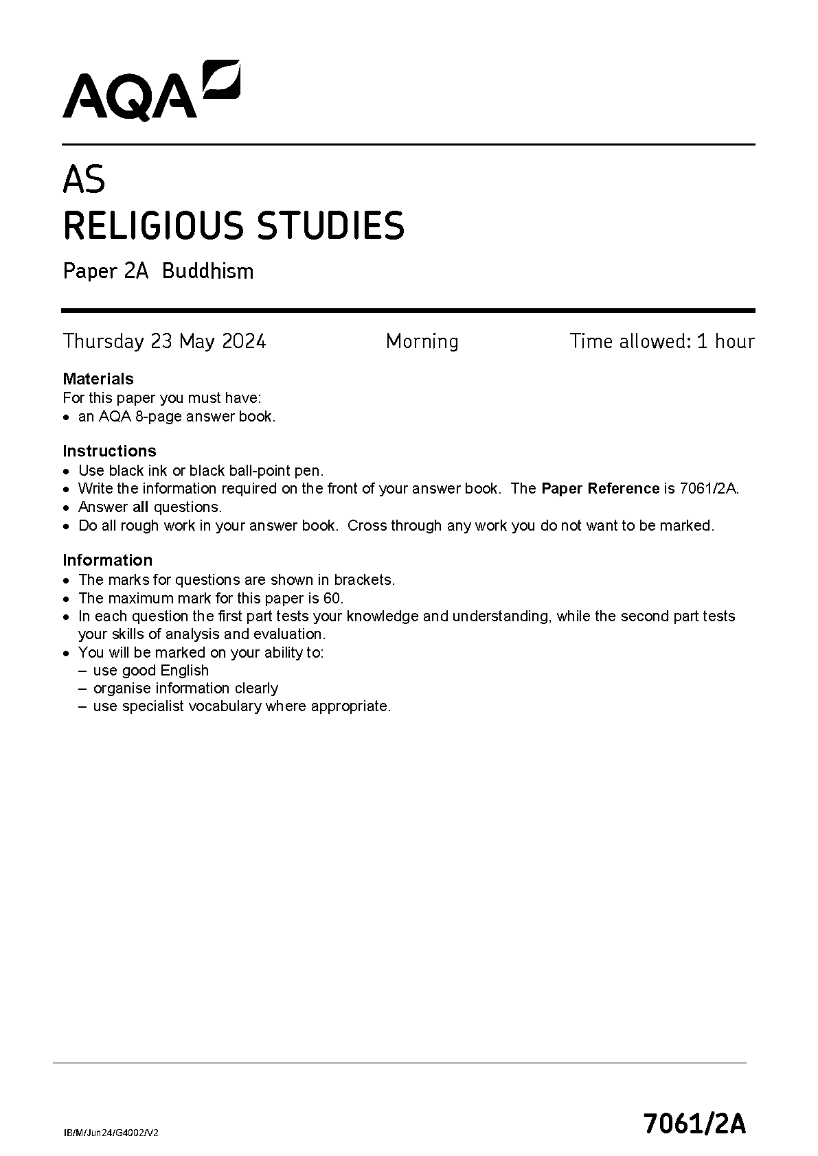 AQA AS RELIGIOUS STUDIES QUESTION PAPER 2A 2024 (7061/2A: Buddhism).