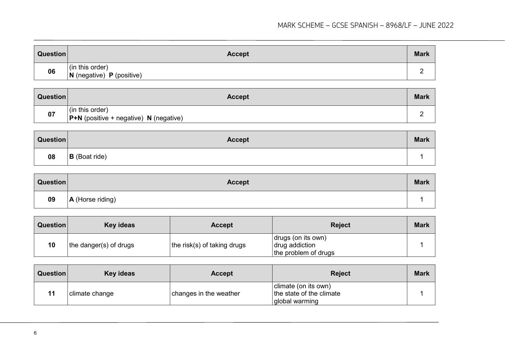 AQA GCSE SPANISH PAPER 1 JUNE 2022 MARK SCHEME (8698/LF: Foundation Tier - Listening)