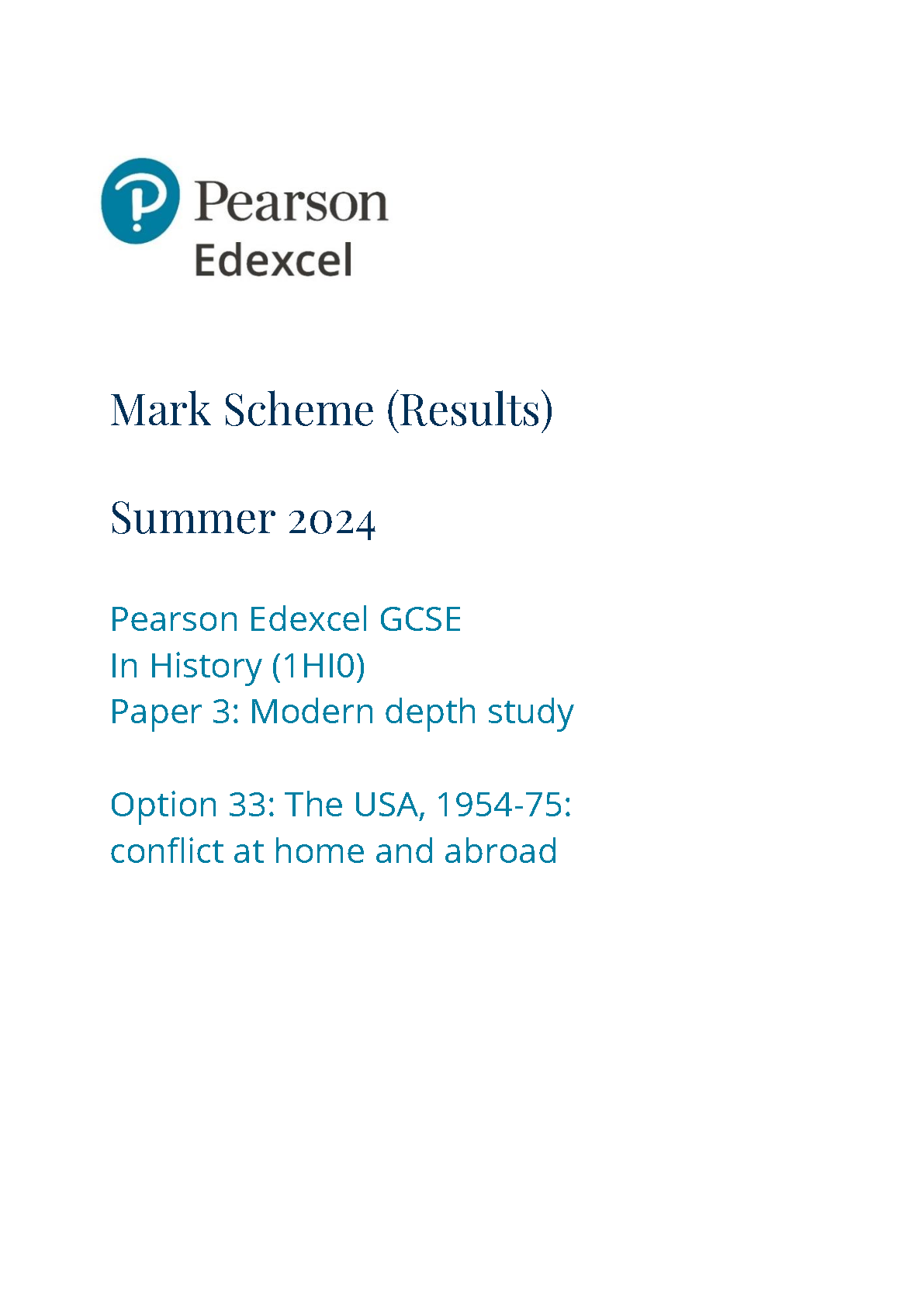 2024 PEARSON EDEXCEL GCSE HISTORY MARK SCHEME PAPER 3 (1HI0/33: Modern depth study Option 33: The USA, 1954–75: conflict at home and abroad). DOWNLOAD THE OFFICIAL AND VERIFIED ON www.hackedexams.com