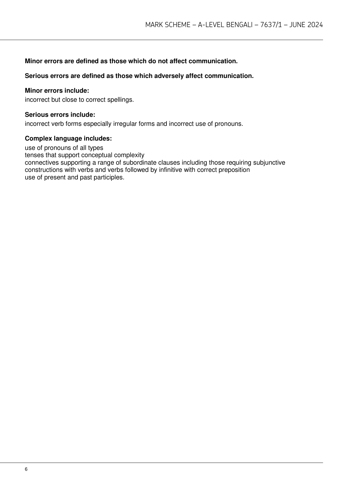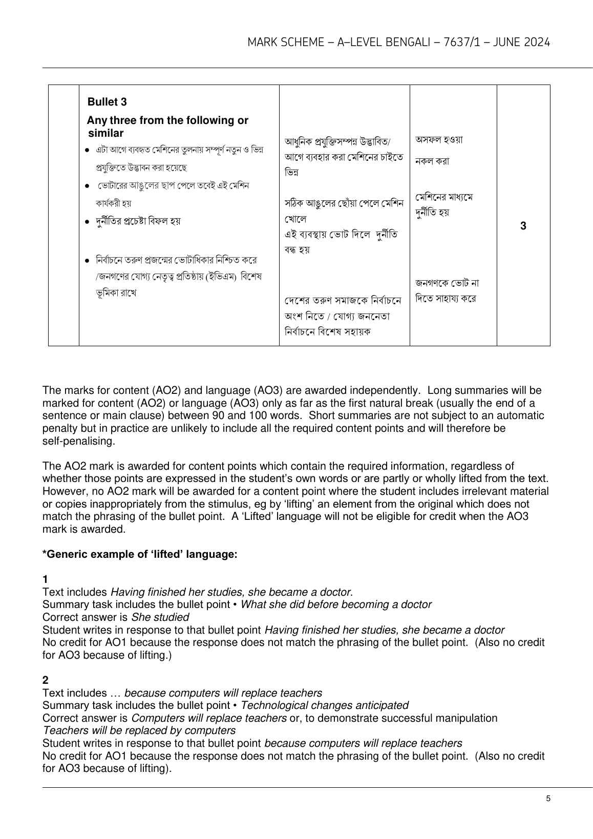 Heading: 2024 AQA A LEVEL BENGALI PAPER 1 MARK SCHEME (7637/1: Reading and Writing)