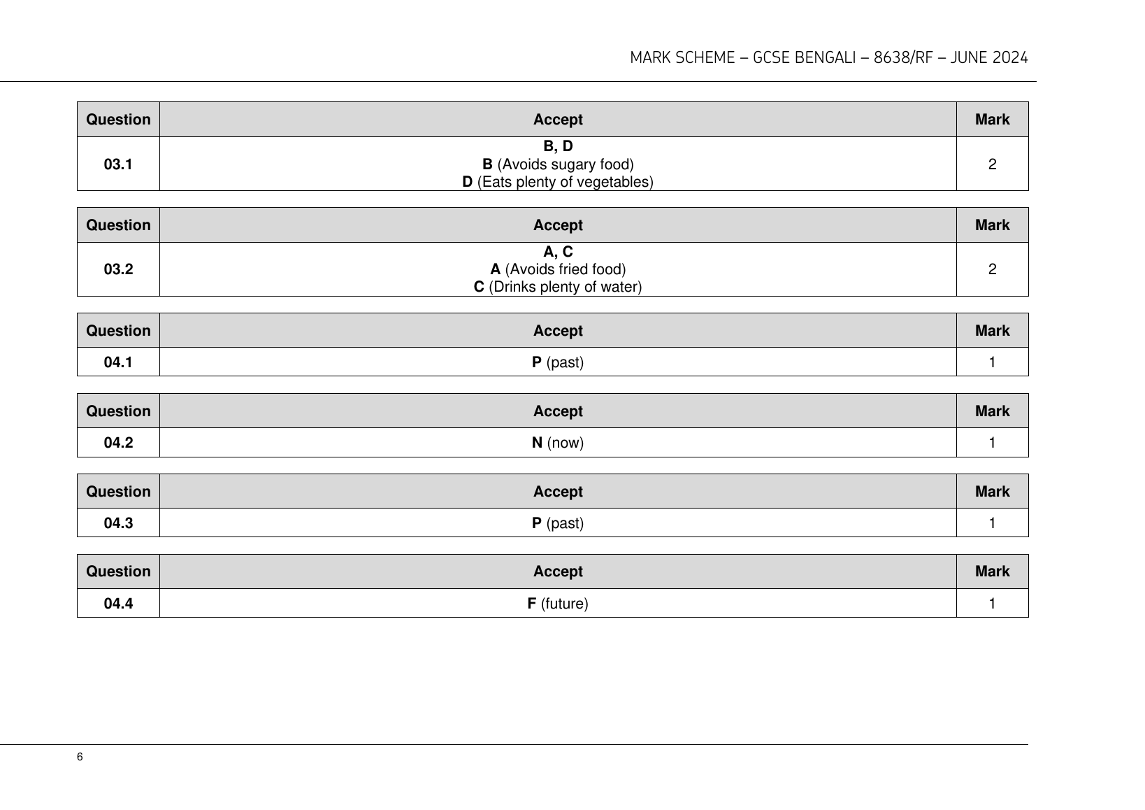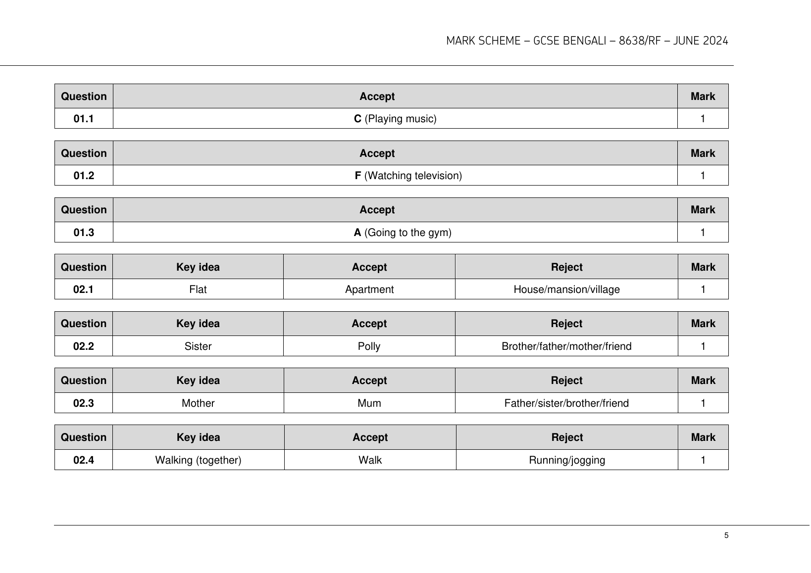 2024 AQA GCSE BENGALI MARK SCHEME PAPER 3 (8638/RF: Reading Foundation Tier).