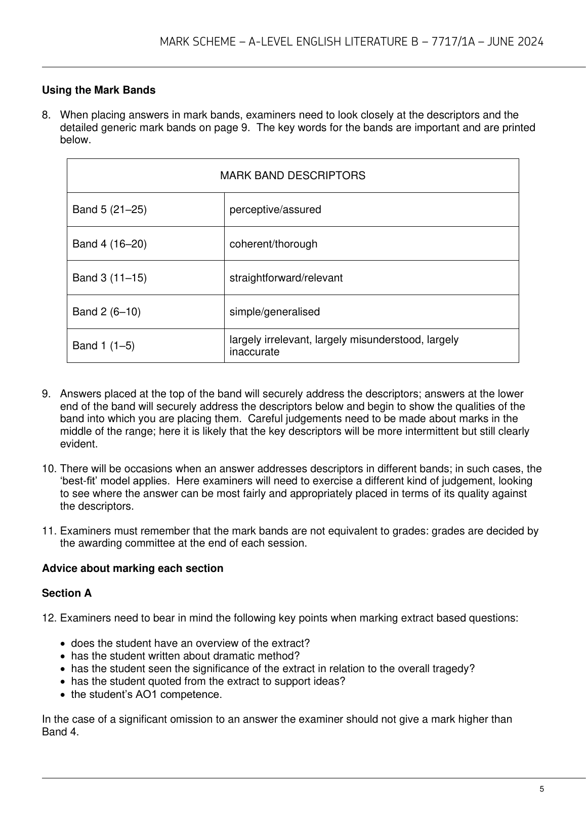 2024 AQA A LEVEL ENGLISH LITERATURE B PAPER 1A MARK SCHEME (7717/1A: Literary Genres: Aspects of Tragedy)