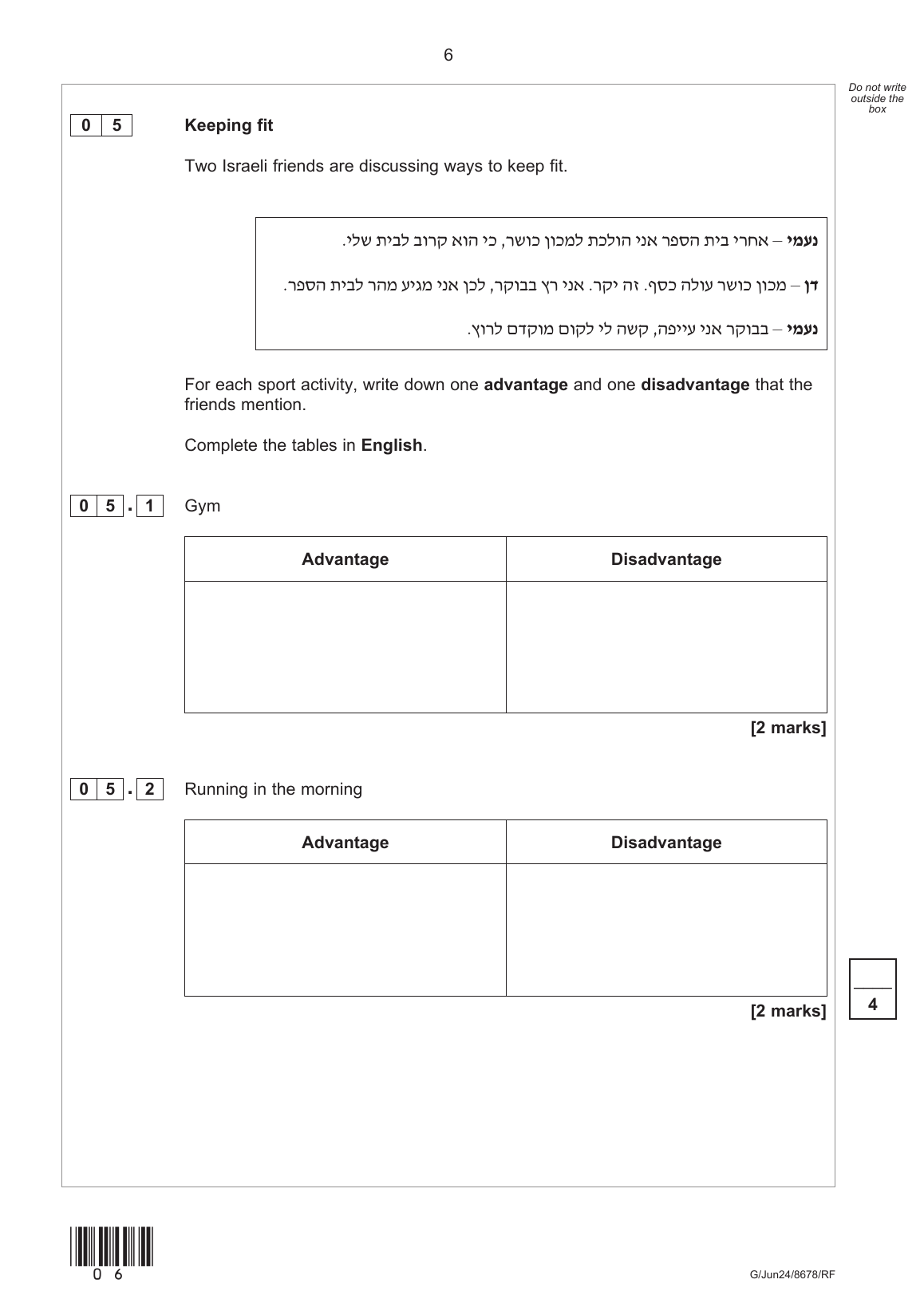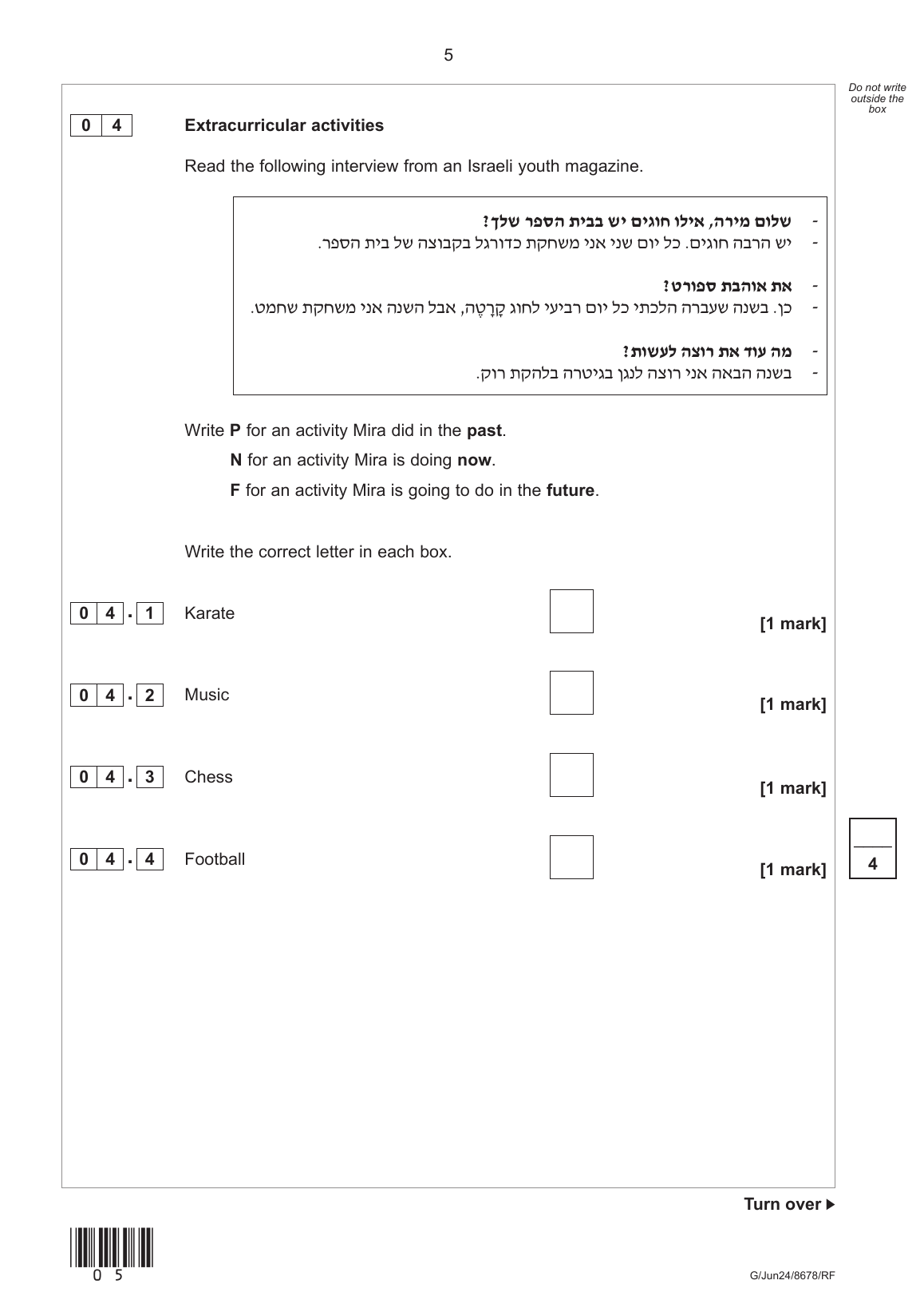 2024 AQA GCSE MODERN HEBREW QUESTION PAPER 3 (8678/RF: Foundation Tier Reading).