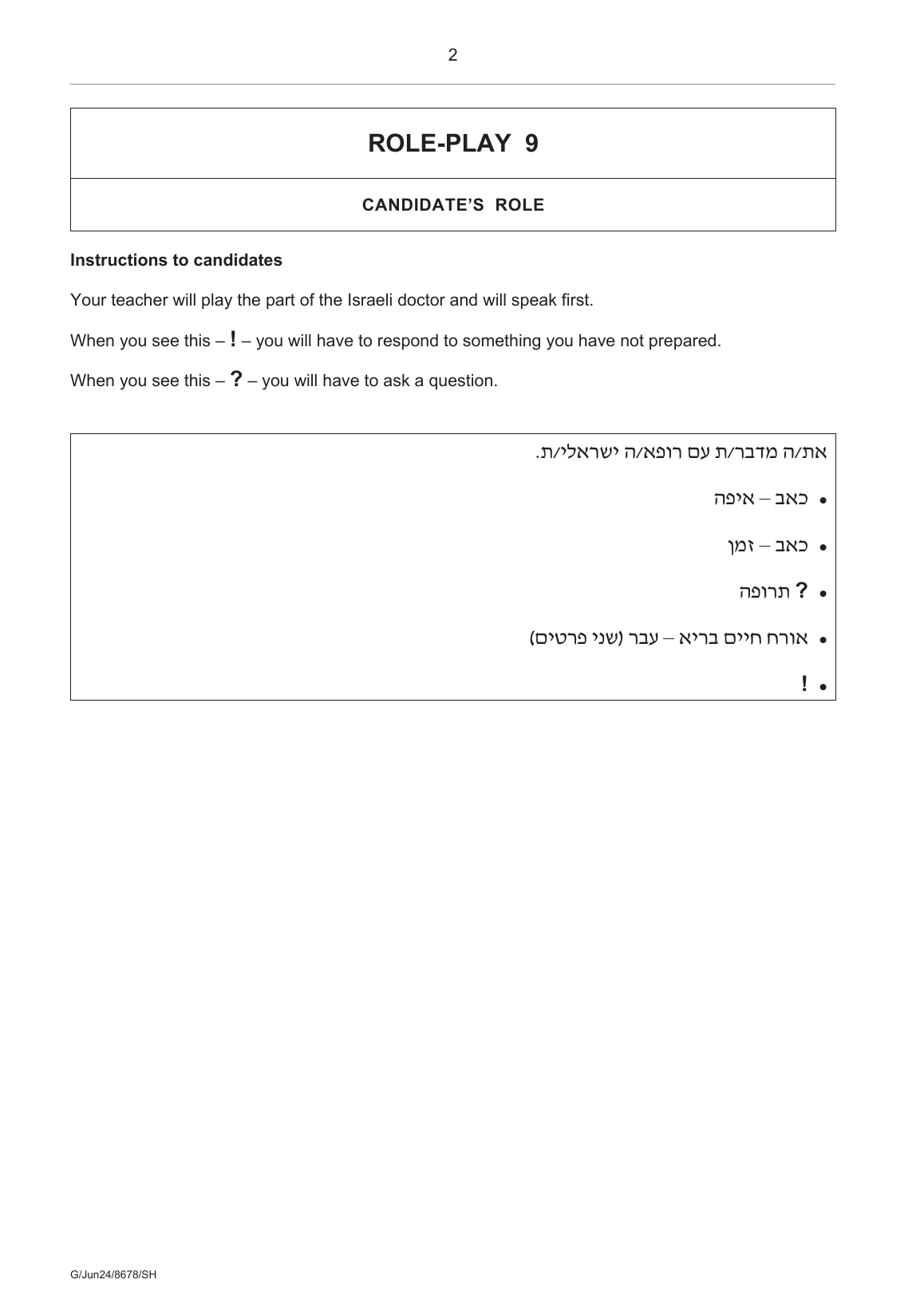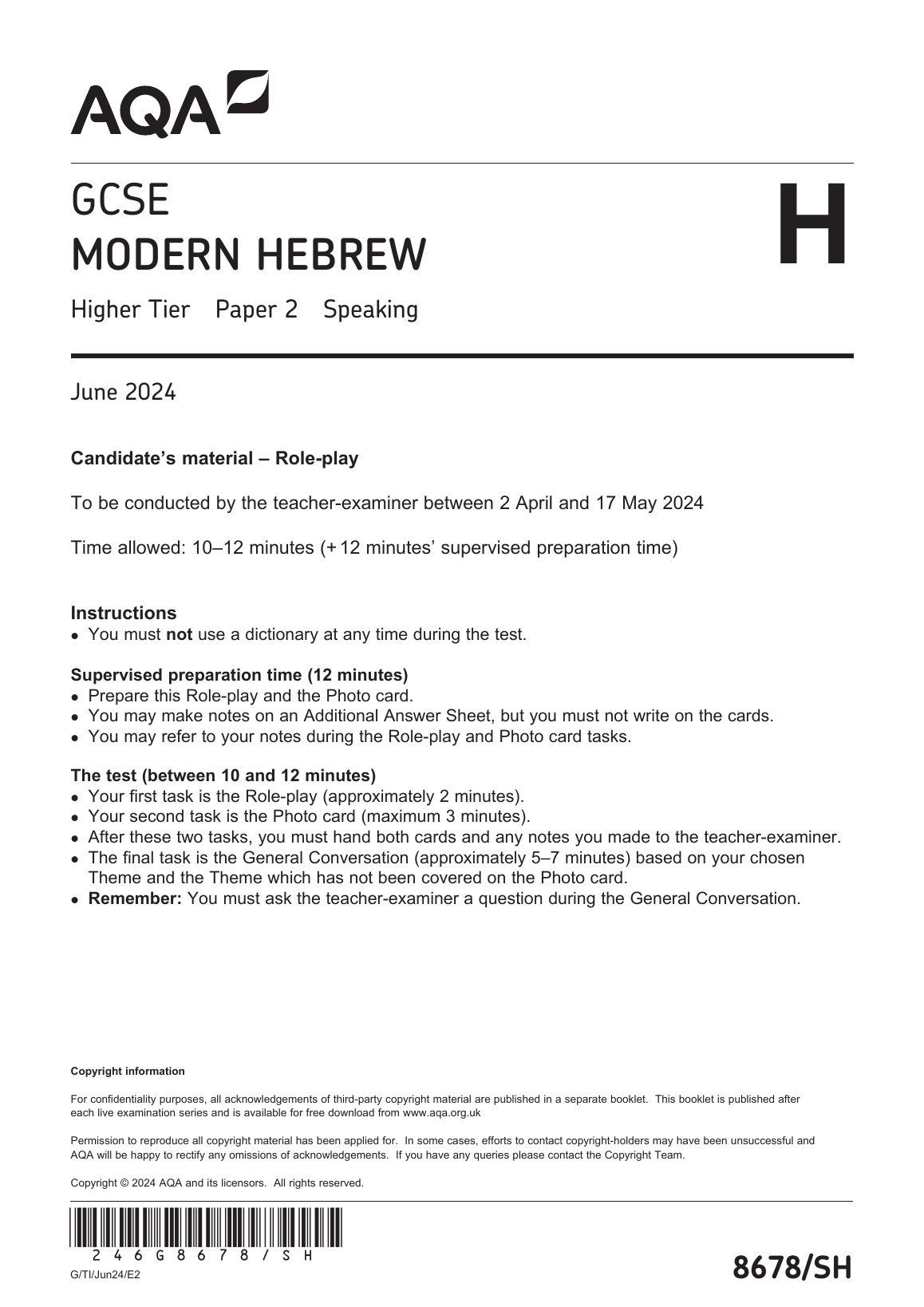 2024 AQA GCSE MODERN HEBREW QUESTION PAPER 2 (8678/SH: Higher Tier Speaking).