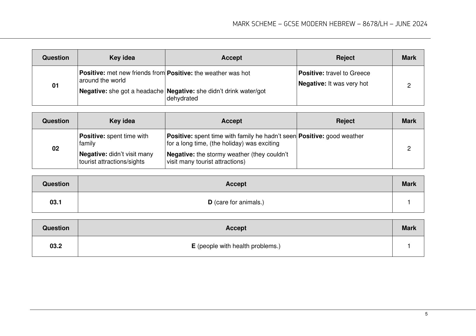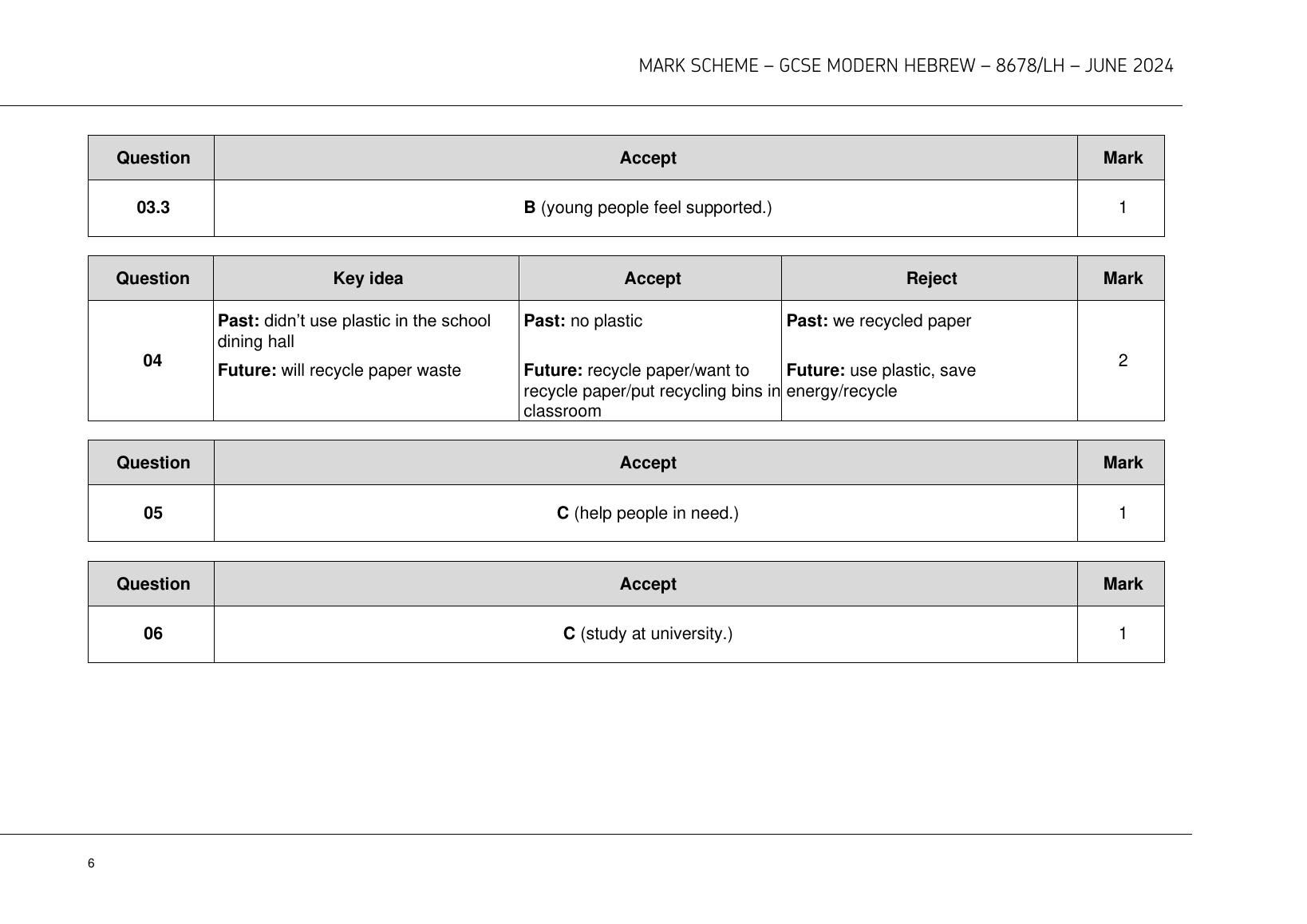2024 AQA GCSE MODERN HEBREW MARK SCHEME PAPER 1 (8678/LH: Listening Higher Tier).