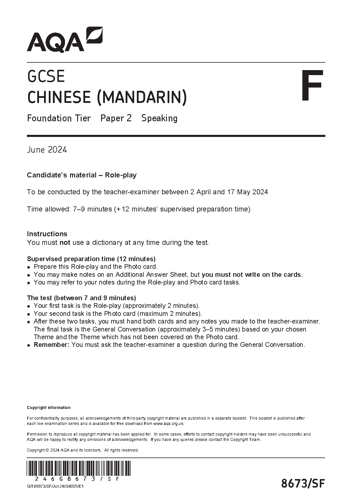 2024 AQA GCSE CHINESE (MANDARIN) QUESTION PAPER 2 (8673/SF: Foundation Tier Speaking).