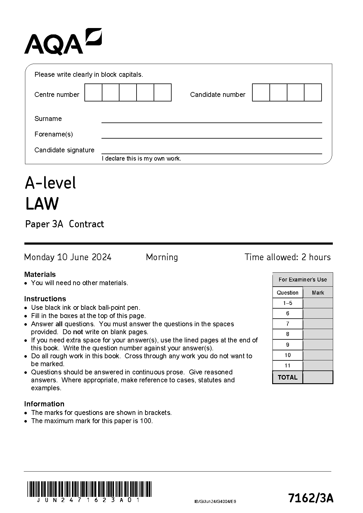 2024 AQA A-LEVEL LAW PAPER 3A (7162/3A: Contract)