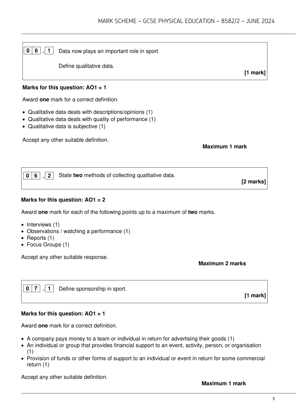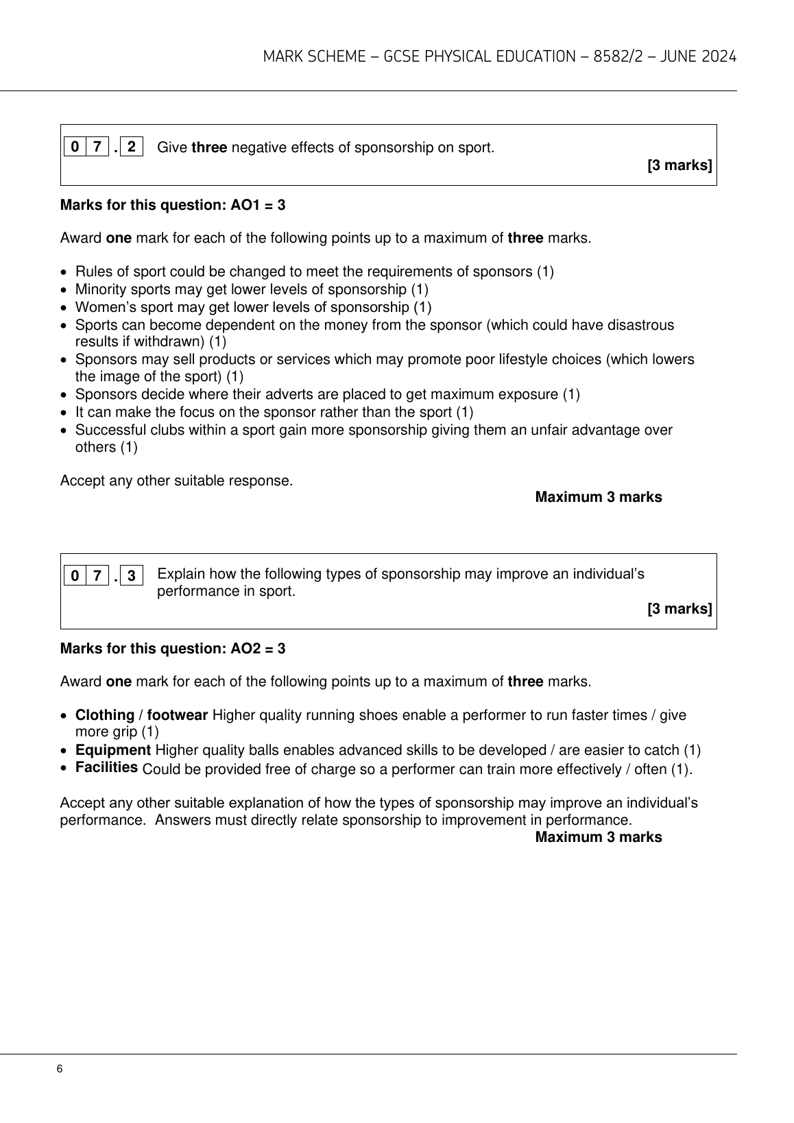 2024 AQA GCSE PHYSICAL EDUCATION MARK SCHEME PAPER 2 (8582/2: Socio-cultural influences and wellbeing in physical activity and sport).