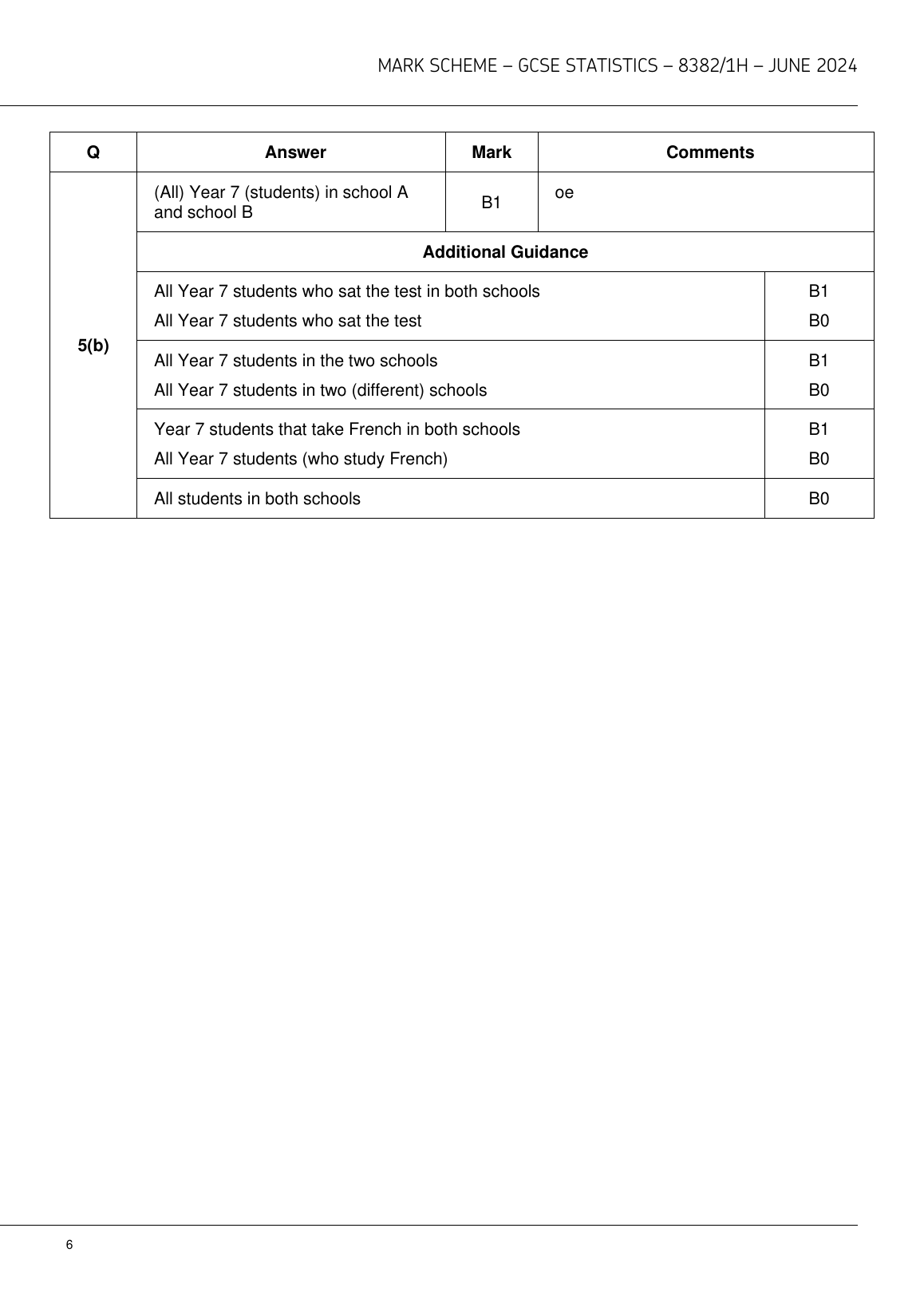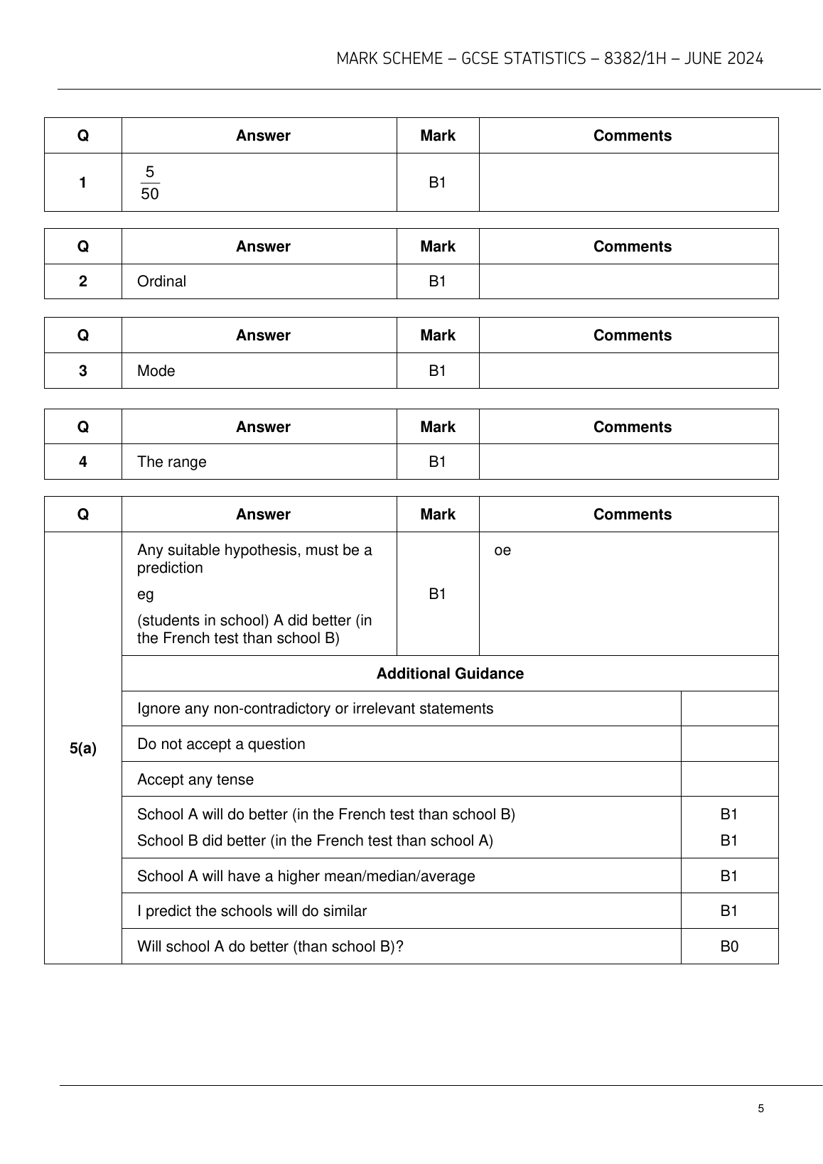 2024 AQA GCSE STATISTICS MARK SCHEME PAPER 1 (8382/1H: Higher Tier).