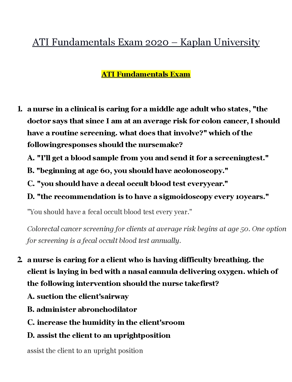 ATI Fundamentals Exam 2020 – Kaplan University UPDATED 2023