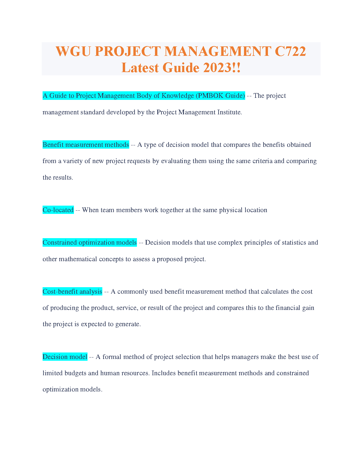 Get your best grade on the WGU C722 Project Management exam with this up to date guide. You will receive a detailed overview of the PMBOK guide and key project management concepts. This study guide is designed for students who want to pass their exam on the first attempt.
