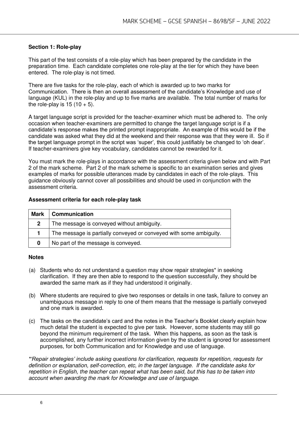 AQA GCSE SPANISH PAPER 2 JUNE 2022 MARK SCHEME (8698/SF: Foundation Tier - Speaking)