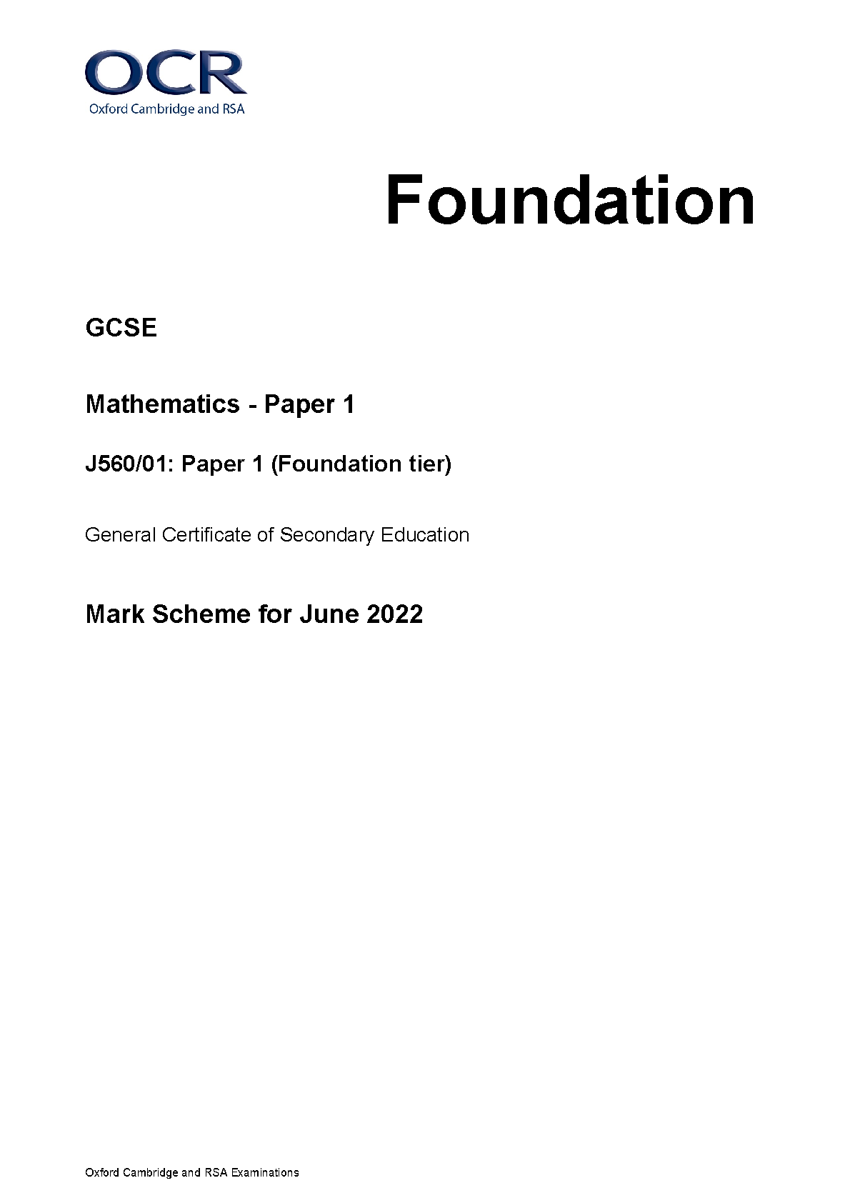 OCR GCSE Mathematics - Paper 1 (Foundation tier) Mark Scheme June 2022