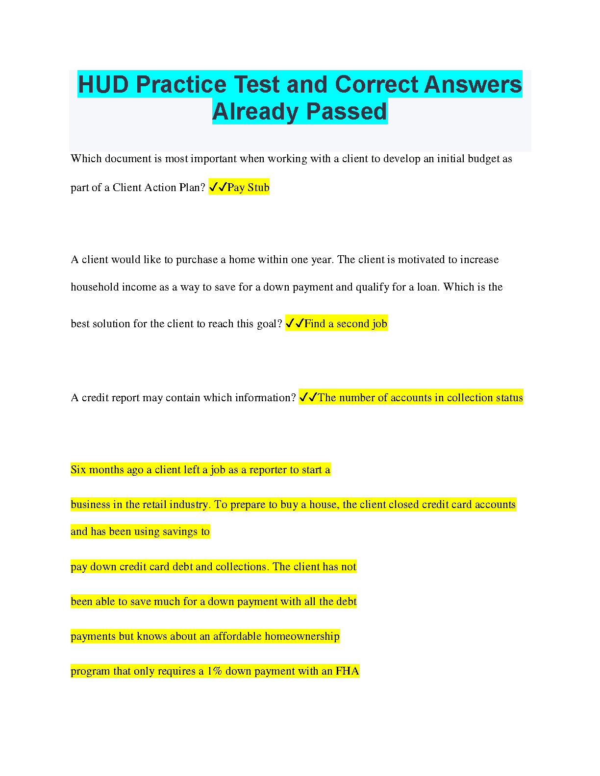 HUD Practice Test and Correct Answers: Ace Your Exam on the First Attempt for 2024/2025