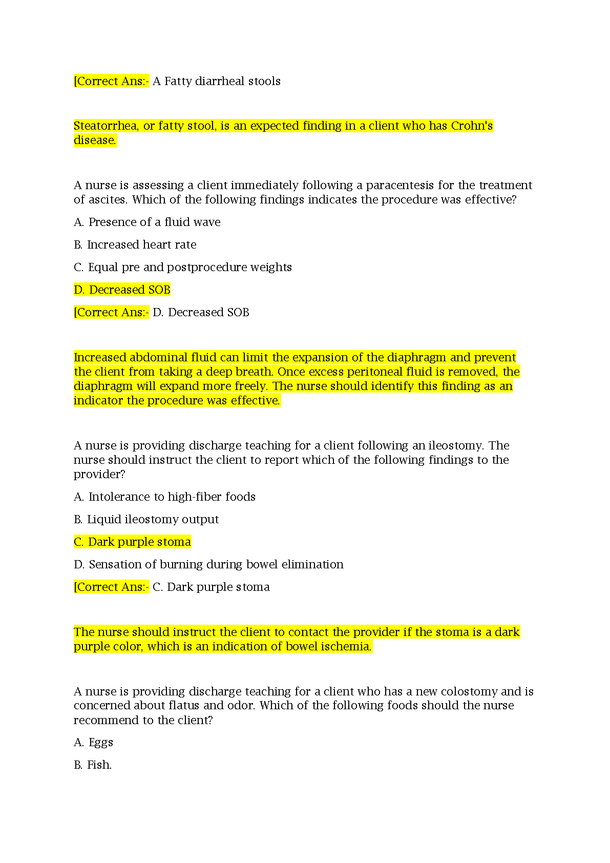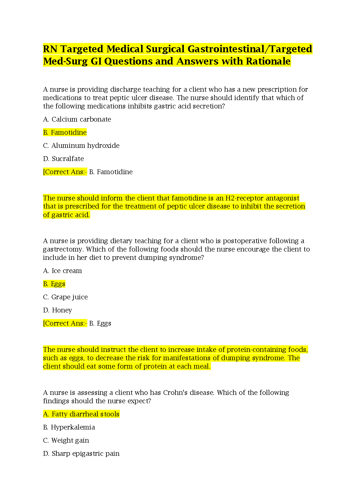 Get ready to conquer your Med-Surg GI exams with this comprehensive study guide, meticulously crafted for the 2024-2025 academic year. This resource features a collection of targeted questions and answers, complete with rationales, covering all the essential concepts in Med-Surg Gastrointestinal care. Boost your understanding and confidently ace your exams on the first try, eliminating the need for resits.