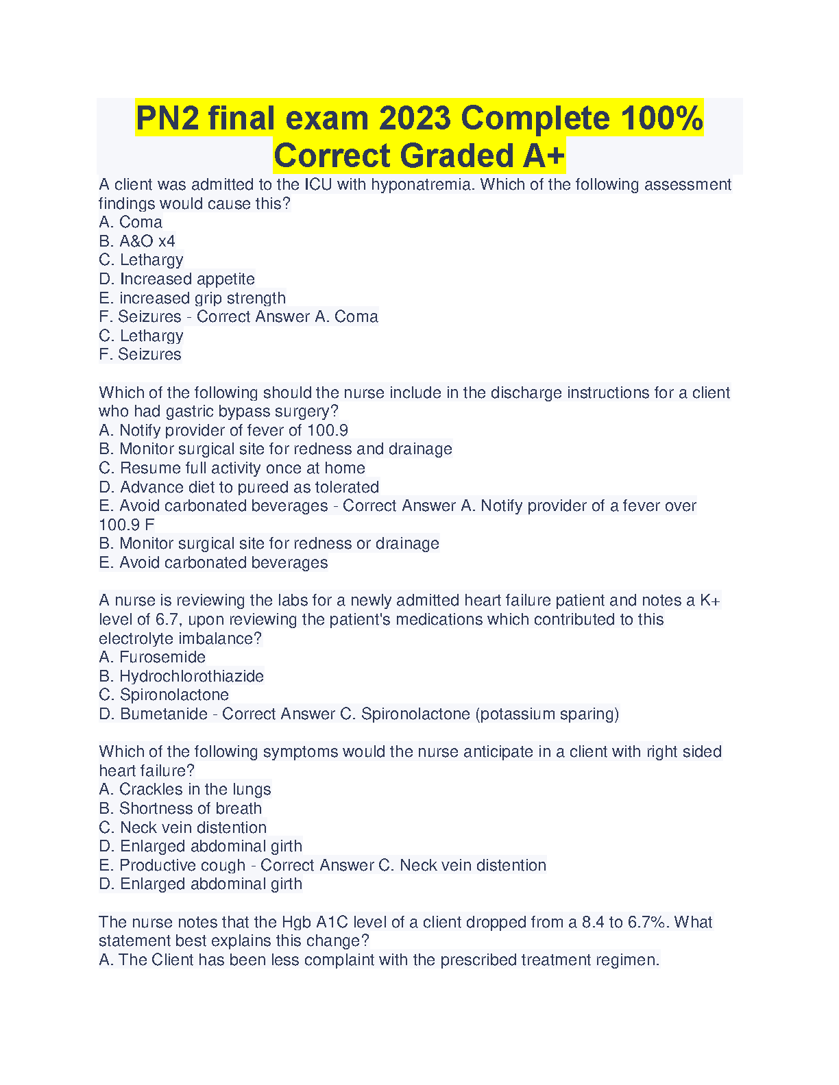 This comprehensive PN2 final exam study guide is packed with high-yield questions and answers covering all important topics, designed to help students pass their exams on the first attempt and avoid resits.