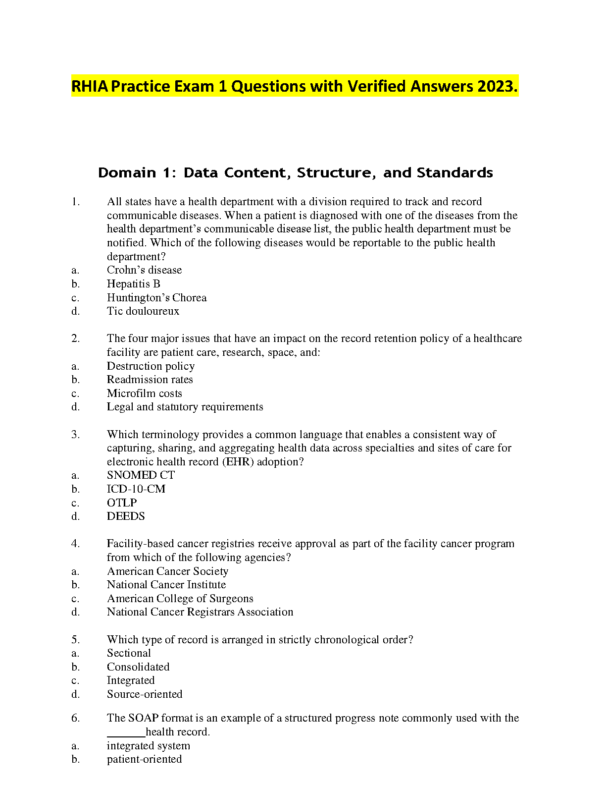 RHIA Practice Exam 1 Questions with Verified Answers 2023 Edition by Unknown Author