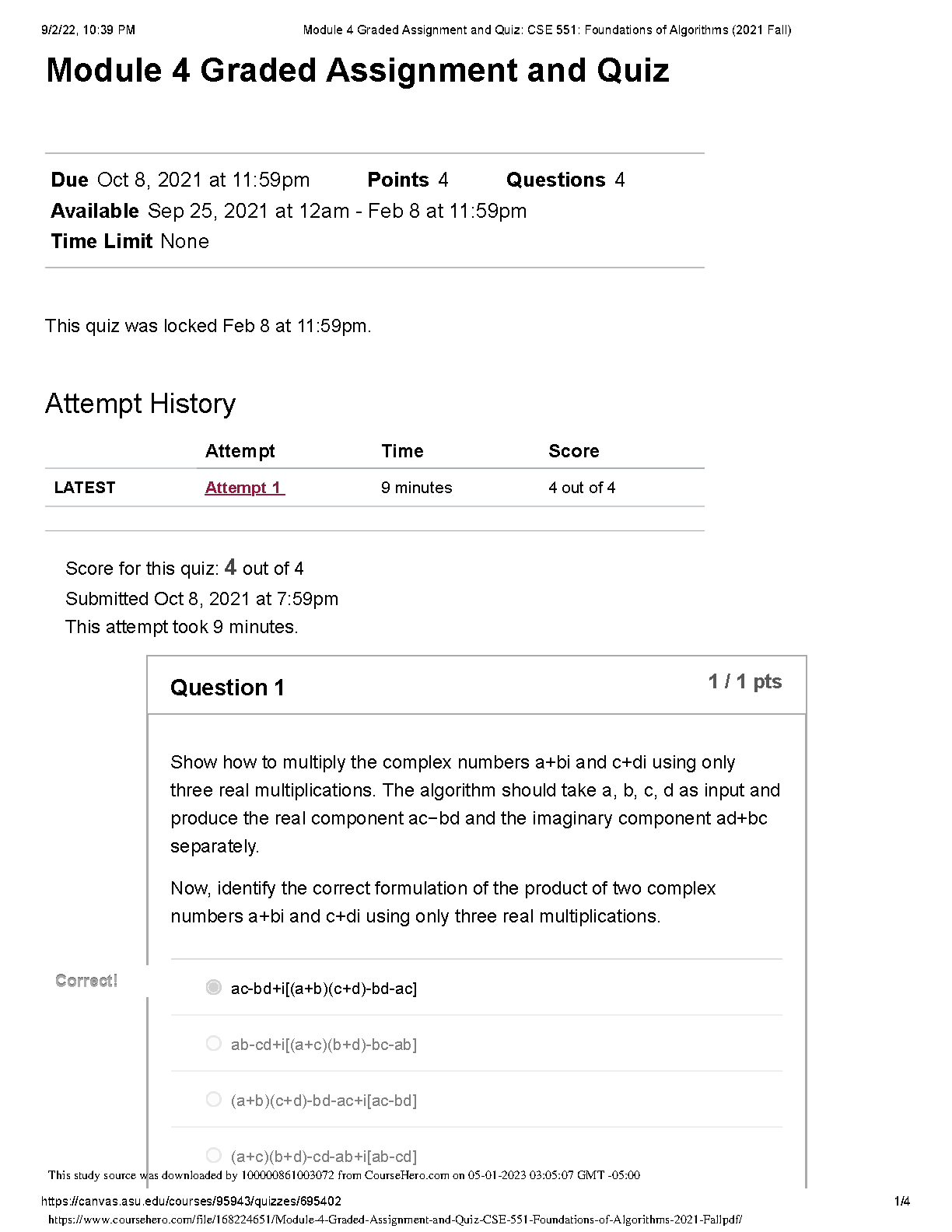 Ace your exam with this comprehensive Module 4 Graded Assignment and Quiz for Foundations of Algorithms (2021 Fall) by Thomas H. Cormen, Charles E. Leiserson, Ronald L. Rivest, Clifford Stein. This resource includes practice questions and solutions, covering complex numbers multiplication, real component calculation, and more, to help you master the concepts and achieve success on your first attempt.