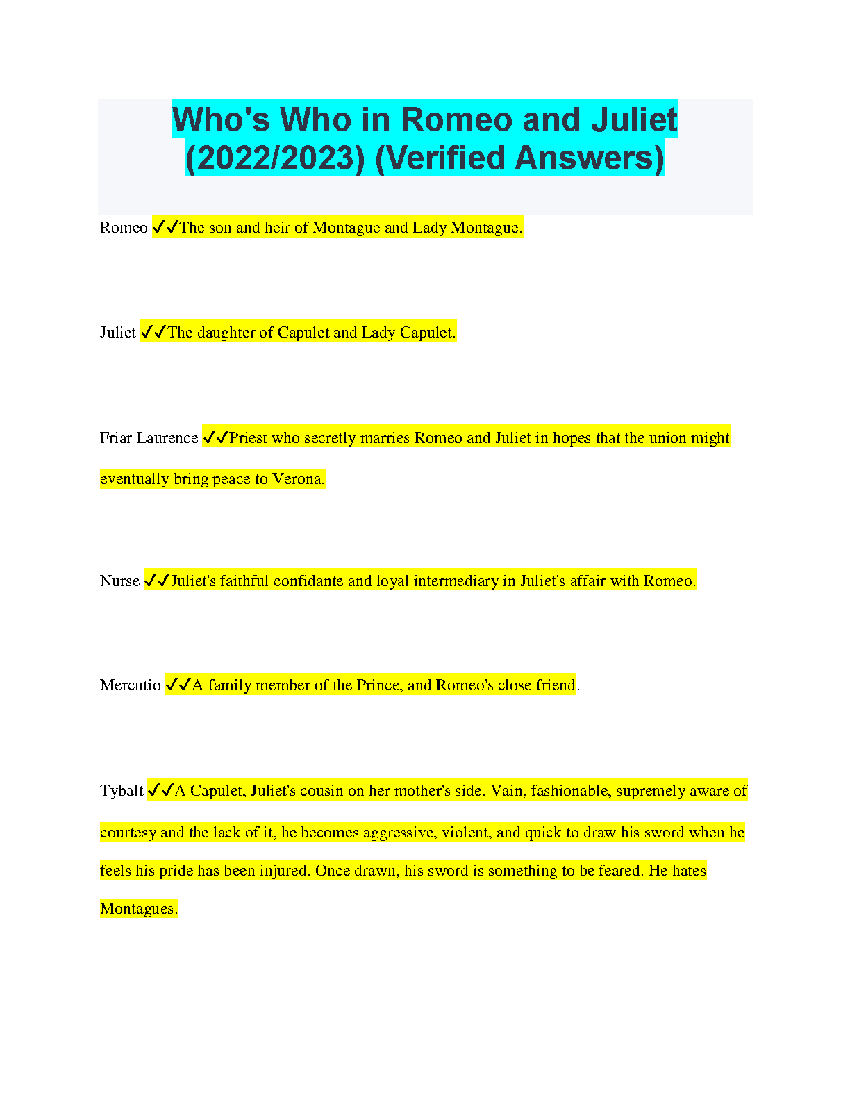 Who's Who in Romeo and Juliet (2022/2023) (Verified Answers) - By William Shakespeare