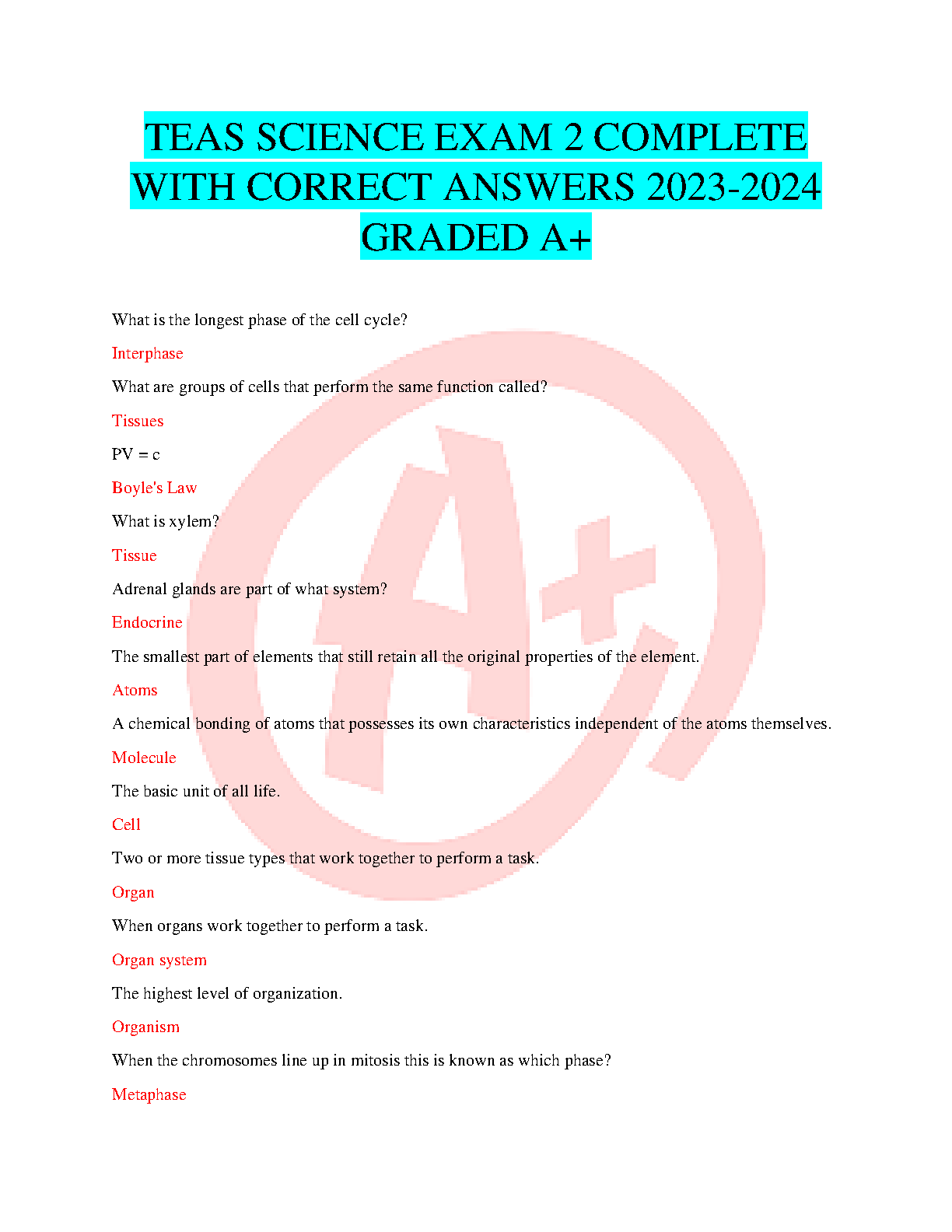 TEAS Science Exam 2 Complete with Correct Answers 2023-2024 - Graded A+