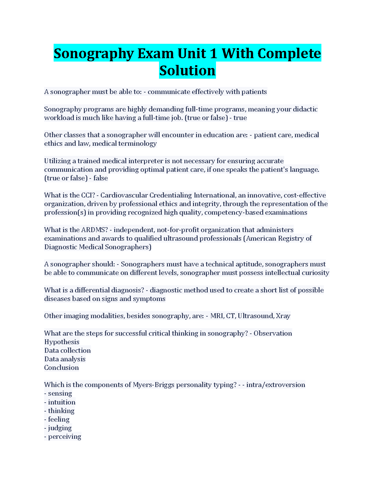 Sonography Exam Unit 1 With Complete Solution - 2024/2025 Edition - Ace Your Exam on the First Try!